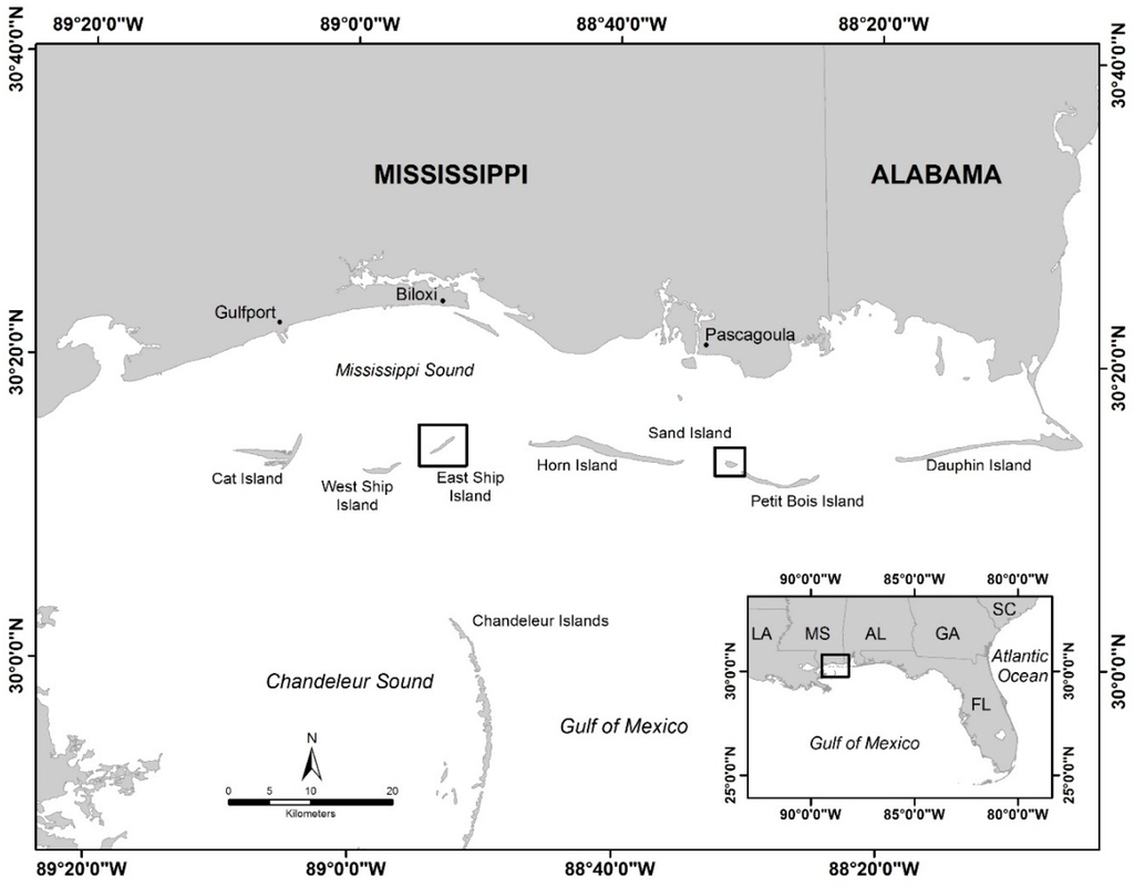 The MS barrier island chain, USA, showing the East Ship and Sand Island study sites.