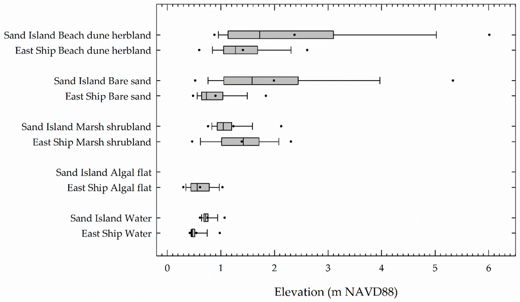 In evaluating the similarities and differences between habitats and their respective elevations on both islands, it was noted that the range of water habitat on East Ship is larger and exists at lower elevations than water on Sand Island. This is presumably due to East Ship’s pond being periodically tidally influenced, whereas Sand Island’s pond is not. Although algal flat exists on East Ship and not on Sand Island, the habitat spans the entire range of elevation that the water habitat occupies on both islands. This is a function of a low elevation gradient and frequent tidal inundation found on the low elevated spits of East Ship Island. Sand Island lacks these particular geographic features. Interestingly, although Sand Island has a higher overall elevation by approximately 4.8 m, the majority of its climax community species, which fall under the marsh shrubland habitat, exists at a lower range of elevation than the comparable community and habitat on East Ship. Currently, we attribute the higher range of elevation in marsh shrubland on East Ship to the differences between elevation gradients between the two islands. However, this subject warrants its own study. Finally, the ranges and overall elevation of bare sand and beach dune herbland were greater on Sand Island (Figure 6). The high between-island variability in elevations for these habitats is a function of Sand Island being created through artificial deposition of dredge material.