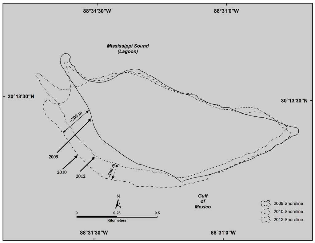 This study was supported by NOAA and was conducted under a research permit provided by the U.S. National Park Service, Gulf Islands National Seashore (GUIS). The authors would like to thank GUIS for providing the permit and additional historical background information. Thanks to David Mooneyhan, Alan Criss, Chris Brown and Les Graham of the University of Southern Mississippi, Gulf Coast Geospatial Center, for technical support and the USDA for providing the NAIP imagery.