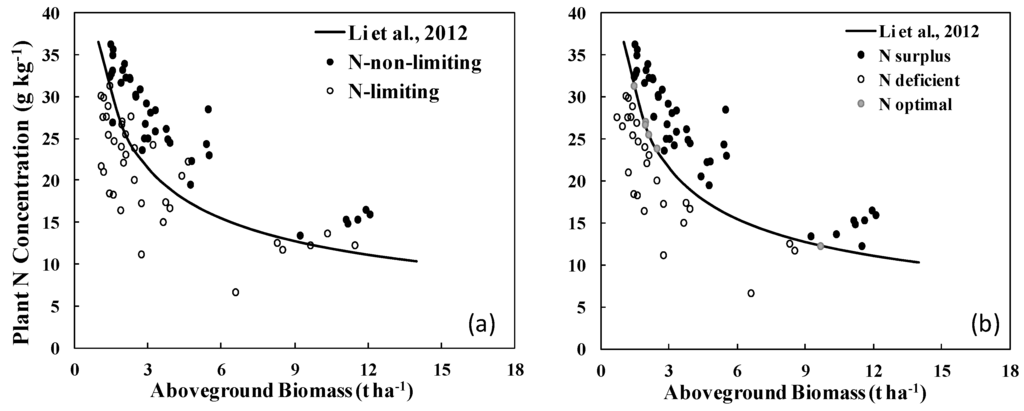 When plotting PNC and AGB data together with the Nc dilution curve (Figure 3), 84% of N-limiting data points were below the curve and 97% of non-N-limiting data points were above the curve (Figure 3a). From Figure 3b, it was obvious that N surplus dots were all above the Nc dilution curve, N deficient dots were all below the curve, and N optimal dots were all on or close to the curve. These results indicated the validity of this critical N dilution curve for Lishu region.