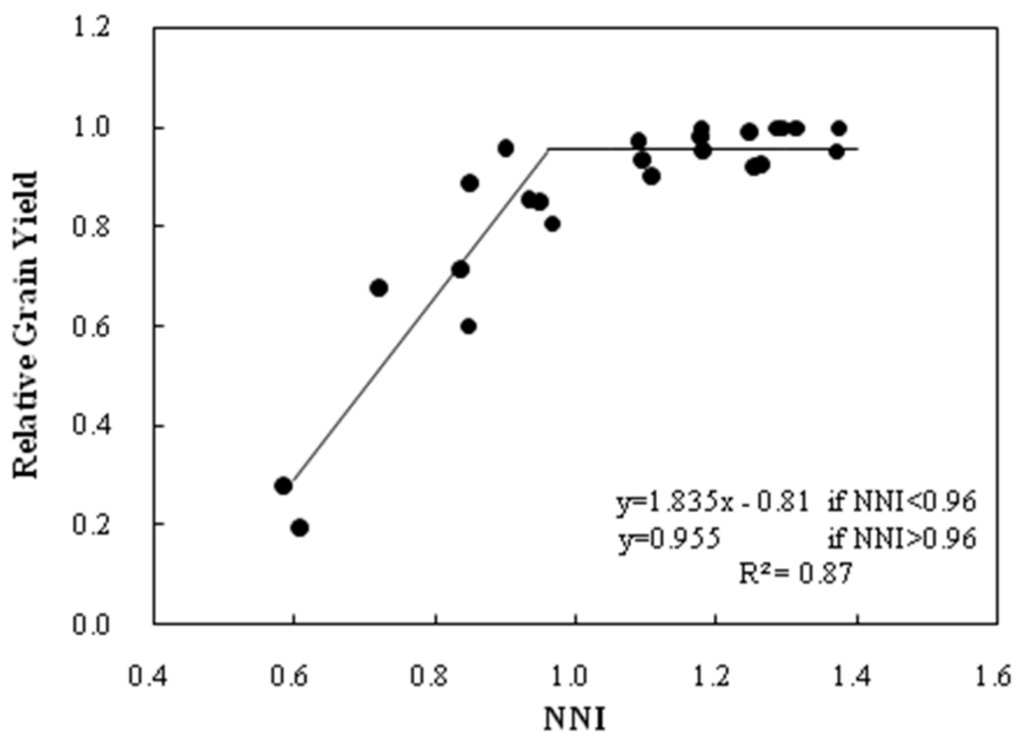 Relationships between relative grain yield and the N nutrition index (NNI) of spring maize. The NNI data were averaged over all sampling dates (V7, V8, V9, and V10).