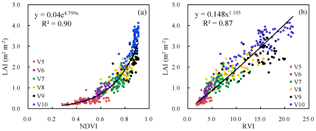 Relationships between leaf area index (LAI) and GreenSeeker sensor-based normalized difference vegetation index (NDVI) (a) or ratio vegetation index (RVI) (b) across V5 to V10 growth stages in 2014–2015.