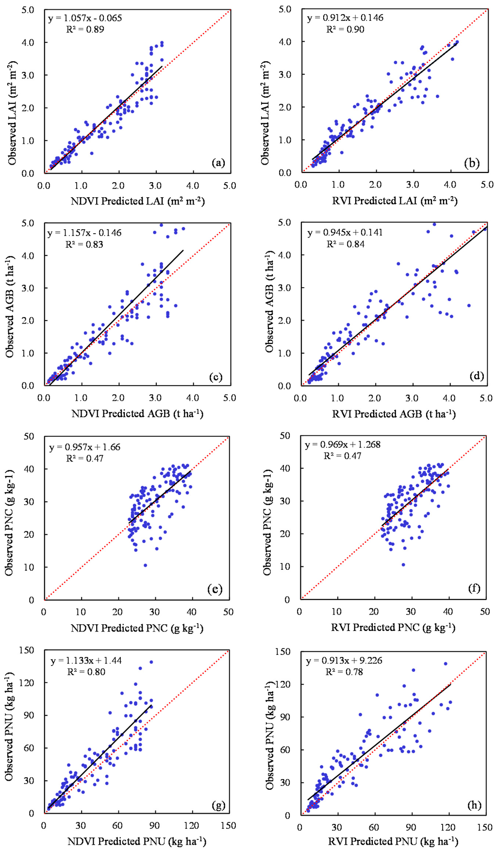 Relationships between the predicted and observed spring maize leaf area index (LAI) (a,b); aboveground biomass (AGB) (c,d); plant N concentration (PNC) (e,f); and plant N uptake (PNU) (g,h) for the validation dataset (n = 132) using the established model across growth stages with GreenSeeker sensor-based indices (normalized difference vegetation index (NDVI) and ratio vegetation index (RVI)). Black and red lines indicate the regression and the 1:1 lines, respectively.