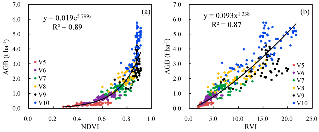 Relationships between aboveground biomass (AGB) and GreenSeeker sensor-based normalized difference vegetation index (NDVI) (a) or ratio vegetation index (RVI) (b) across V5 to V10 growth stage in 2014–2015.