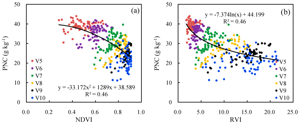 Relationships between plant N concentration (PNC) and GreenSeeker sensor-based normalized difference vegetation index (NDVI) (a) or ratio vegetation index (RVI) (b) across V5 to V10 growth stages in 2014 and 2015.