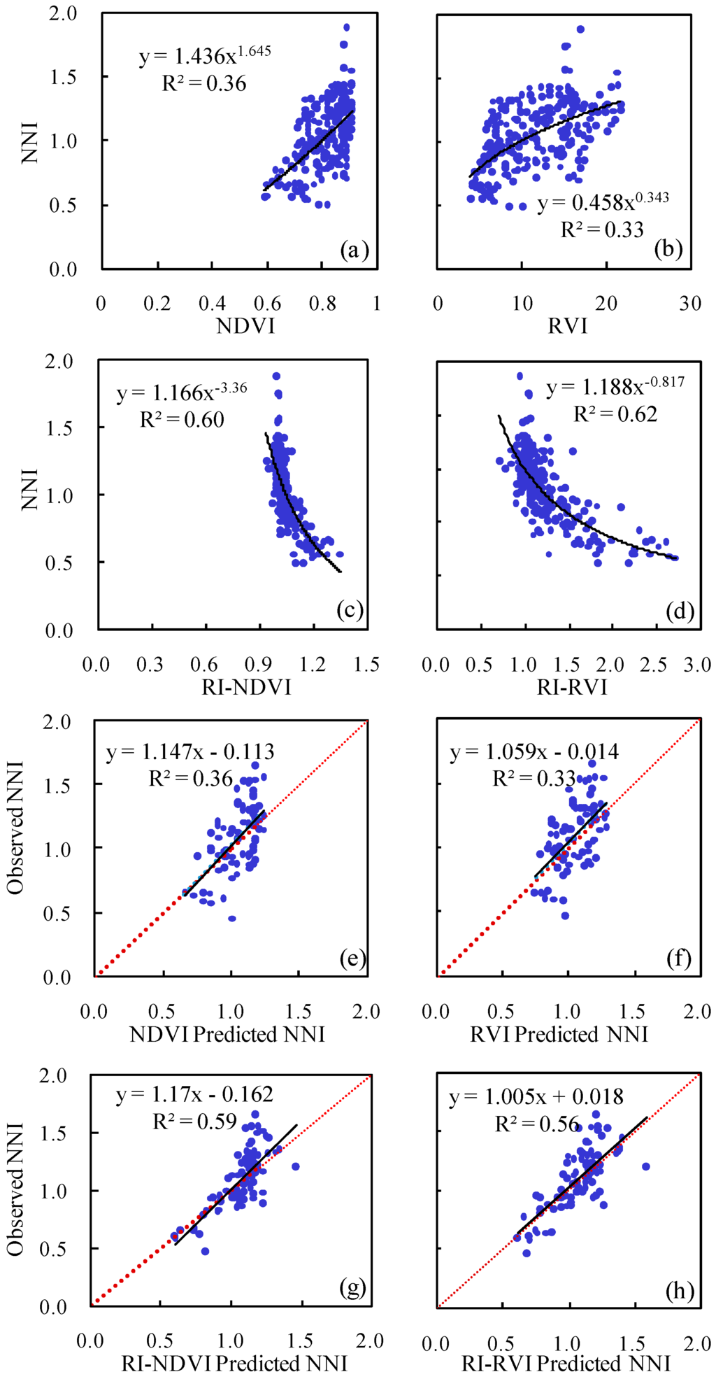 Relationships between N nutrition index (NNI) and GreenSeeker sensor-based normalized difference vegetation index (NDVI) (a); ratio vegetation index (RVI) (b); response index based on NDVI (RI–NDVI) (c) or RVI (RI–RVI) (d) across V7 to V10 growth stages, and validation results for the prediction of NNI using NDVI (e); RVI (f); RI–NDVI (g); and RI–RVI (h). Black and red lines indicate the regression and the 1:1 lines, respectively.