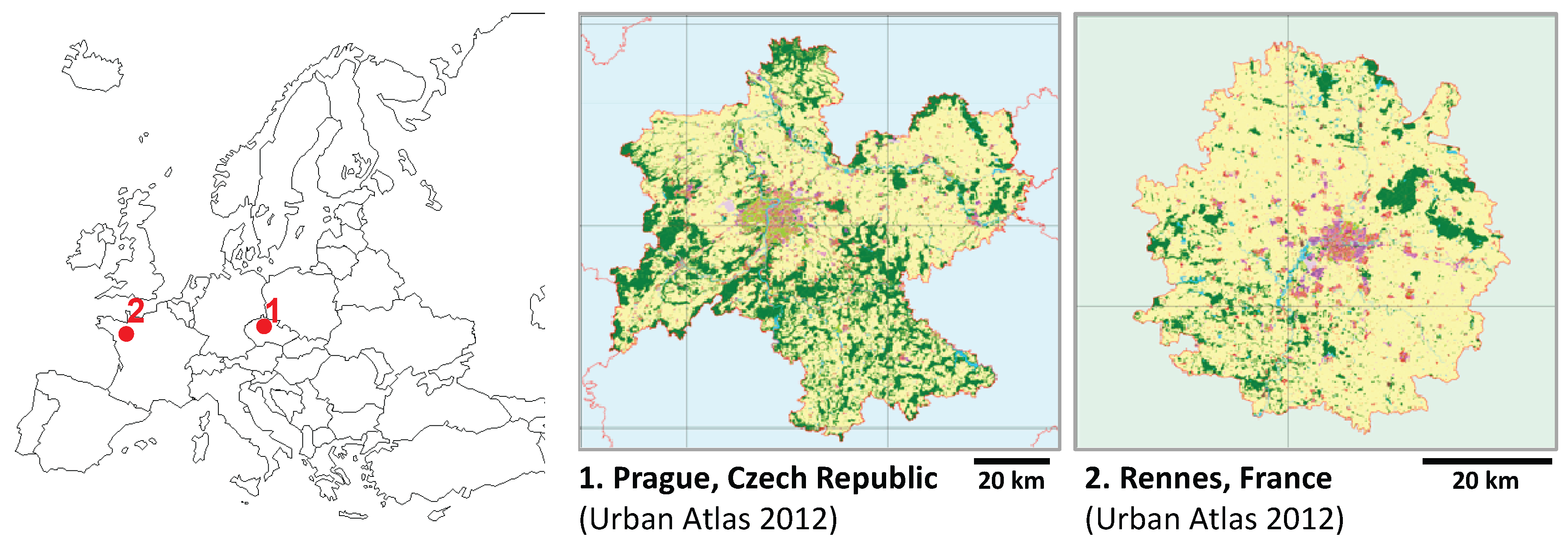 We choose to validate our approaches on two cities of different sizes with different urban planning policies: Prague (over one million inhabitants, 6900 km2), the capital of the Czech Republic, and Rennes (over 200,000 inhabitants, 2500 km2), a mid-sized city in France. The areas are delimited by the contour of the Copernicus Former Urban Areas (FUA) of the Urban Atlas dataset and are visible in Figure 1. In practice, their internal organization is different: while Rennes is mainly composed of medium-sized buildings, individual houses and industrial/commercial areas, Prague is larger and embeds a large historical center connected with big avenues together with old and high level apartments and some modern skyscrapers in its periphery. Therefore, these characteristics are complementary and illustrate the variety of situations one encounters in practice.