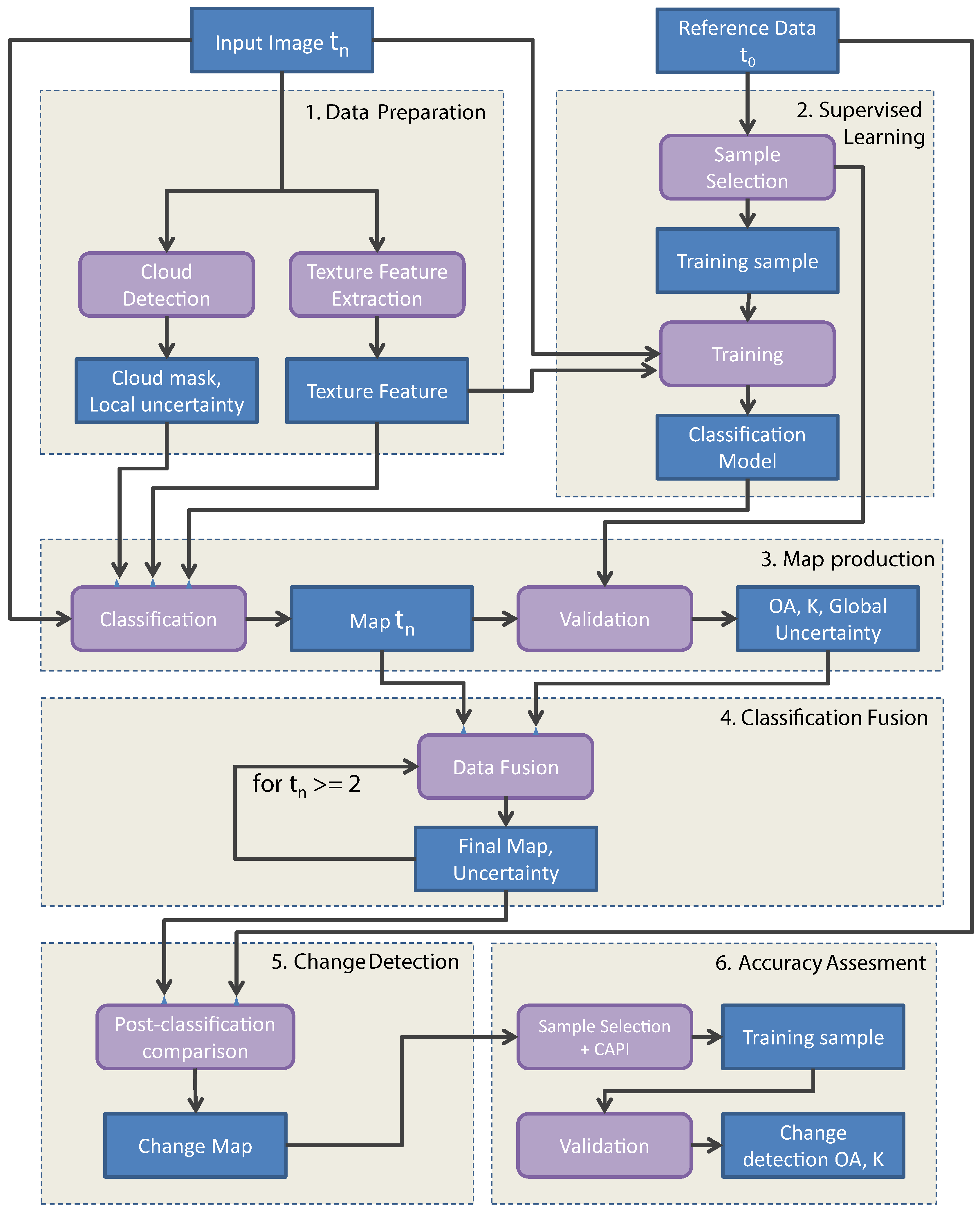 Block diagram of the workflow. Different time steps are noted ... ; stands for “Overall Accuracy”; K is the kappa index; CAPI stands for Computer-Assisted Photo Interpretation.
