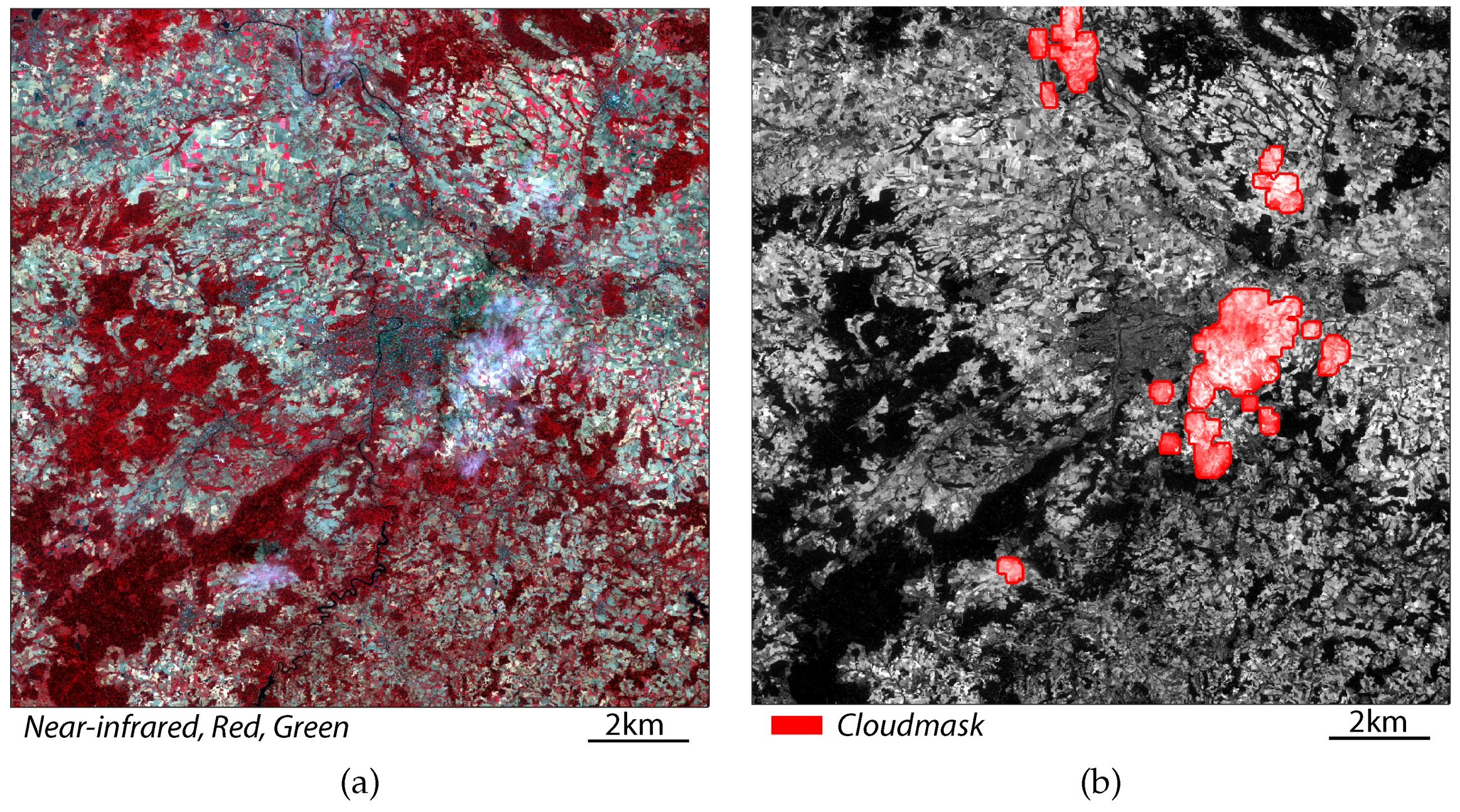 Example of cloud mask detection on a Sentinel-2 image: (a) original Sentinel-2 image; (b) detected cloud mask.