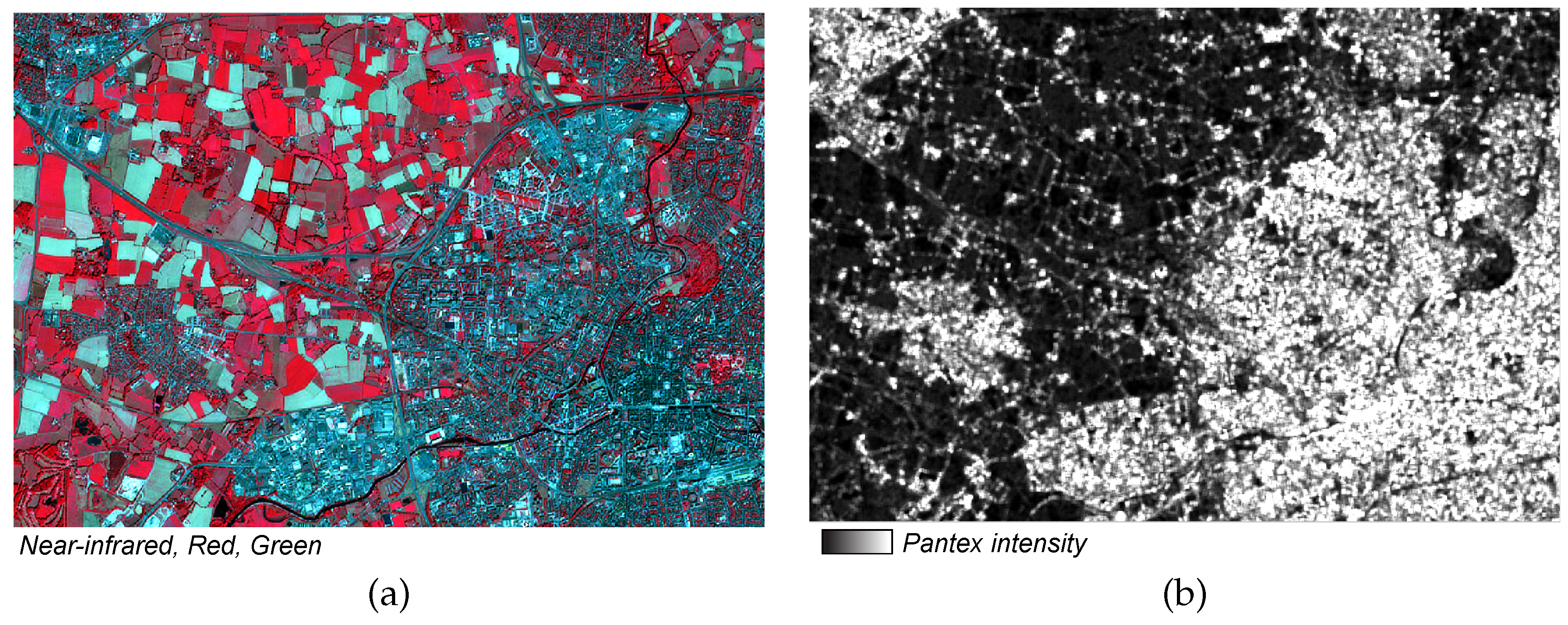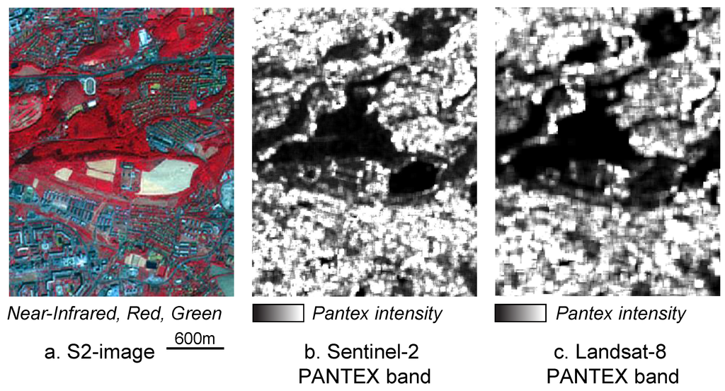To characterize the content of high or very high resolution remote sensing images, texture descriptors are powerful, especially in urban areas, as proven by numerous studies [39,40,41,42,43,44]. Among the existing techniques, the so-called PANTEXmethod [44], which relies on the analysis of the Grey Levels’ Coocurrence Matrices (GLCM) and the computation of associated indexes [45], has the properties of being simple and efficient. To be invariant by rotation and less sensitive to small edges that appear in rural or natural landscapes, PANTEX keeps the minimum value of the energy computed on GLCM in various directions (10 in practice [44]). This enables one to highlight local contrast variation, which is a particularly crucial criteria in an urban area. PANTEX has already proven its efficiency in urban areas at a global level [46], and an example of PANTEX criteria is visible in Figure 4. In practice, PANTEX criteria are computed in the blue band (10-m resolution) in the case of Sentinel-2 and in the panchromatic one (15 m resolution) with Landsat-8.