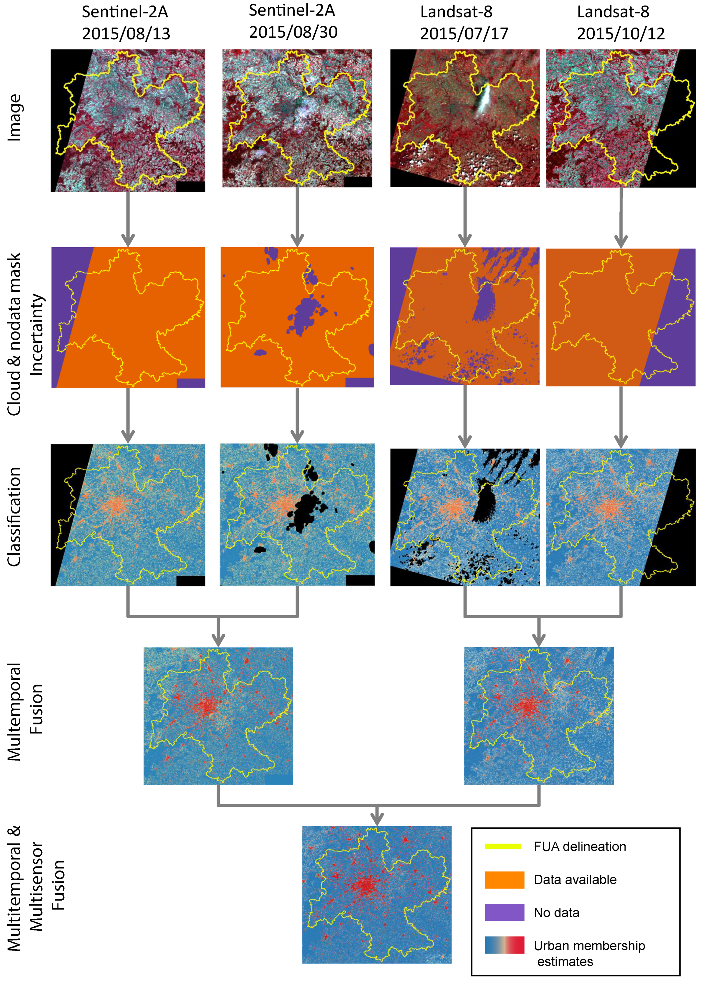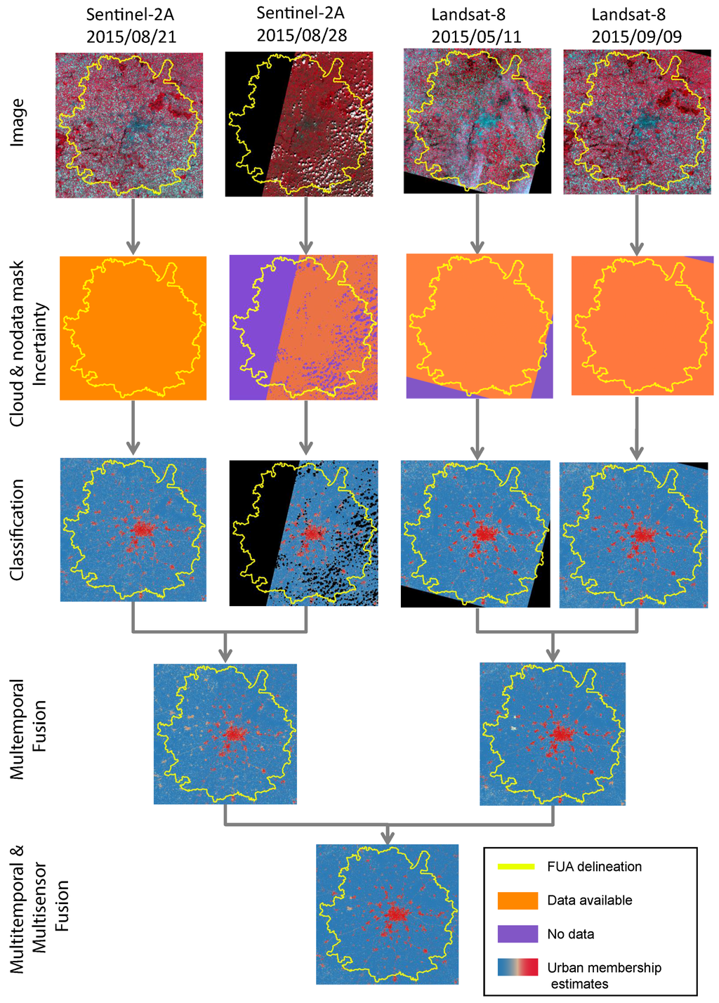 In a remote sensing context, the Dempster–Shafer Theory has mainly been applied to facilitate the decision process for the classification in urban environments [31,32], but also in other various contexts (sea breeze front identification, forestry monitoring or more generally, land cover [33,34,35,36]). Though widely used in remote sensing data, the DST has only rarely been applied in the context of large dataset classification (such as a country or continent) where information availability issues are critical (in terms of repetitiveness, cloud cover, acquisition window, etc). As will be shown later, this idea is explored in this paper where, by fusing individual classifications acquired at different dates, urban classifications are generated combining both an accuracy greater than the individual ones and cloud-free coverage. It is also proposed to combine Sentinel-2 with Landsat-8 images and to evaluate the potential of our approach as a multi-source fusion.