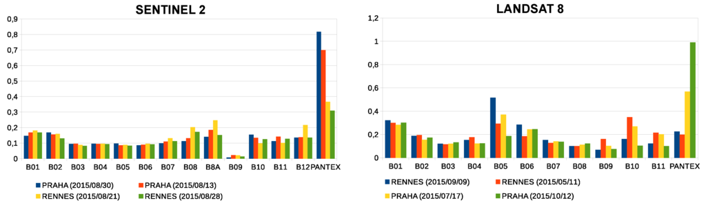 To explain the relative better efficiency of the City of Prague compared to Rennes, let us remind that this region of France is characterized by a very fragmented agricultural landscape with parcels of small sizes, unlike the Prague area, whose agricultural crops are larger. Therefore, some rural areas are more similar in terms of texture than urban ones, and this reduces the rule of PANTEX. Nevertheless, the overall accuracy is still very good and even larger for the city of Rennes.