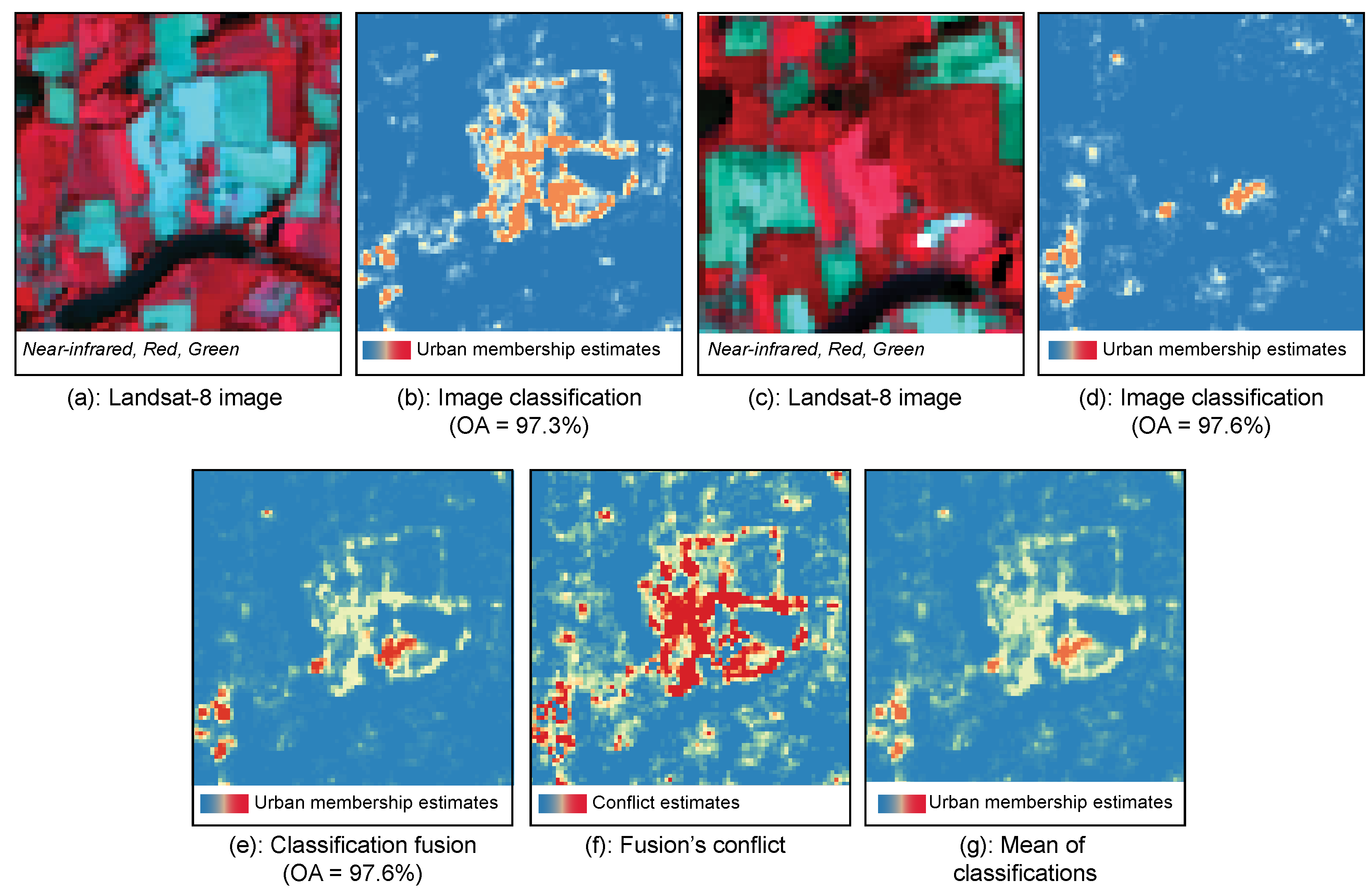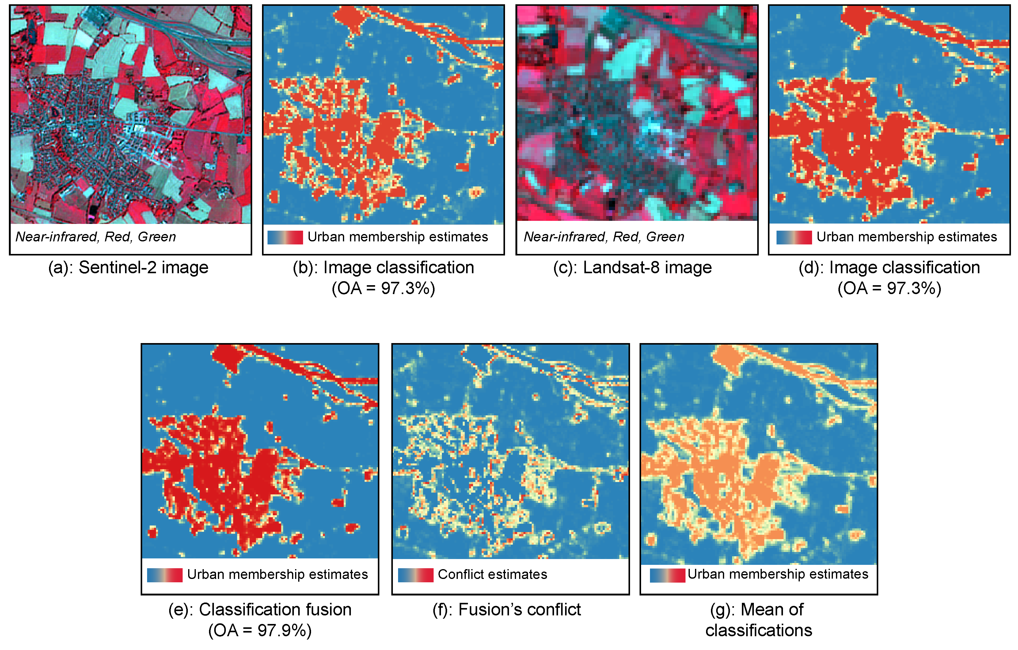 Figure 9. Benefits of the multi-temporal fusion: classification fusion promotes common estimates, whereas the mean of classifications provides less obvious estimation between urban areas and other land covers. (a) Landsat-8 image; (b) Image classification (OA = 97.3%); (c) Landsat-8 image; (d) Image classification (OA = 97.6%); (e) Classification fusion (97.6%); (f) Classification’s conflict; (g) Mean of classifications). - Multi-source fusion (combination of Landsat-8 and Sentinel-2 classifications) enhances also the geometric accuracy from 30 m to 10 m. As presented in Figure 10, the delineation of the urban areas is more sharp on Sentinel-2 image. Fusion of both classifications provides a sharp delineation with high membership values. The conflict map shows also that differences between images were mainly located in the edges of the urban areas. Figure 10g also shows that classification fusion provides sharper edges than the mean of classifications.