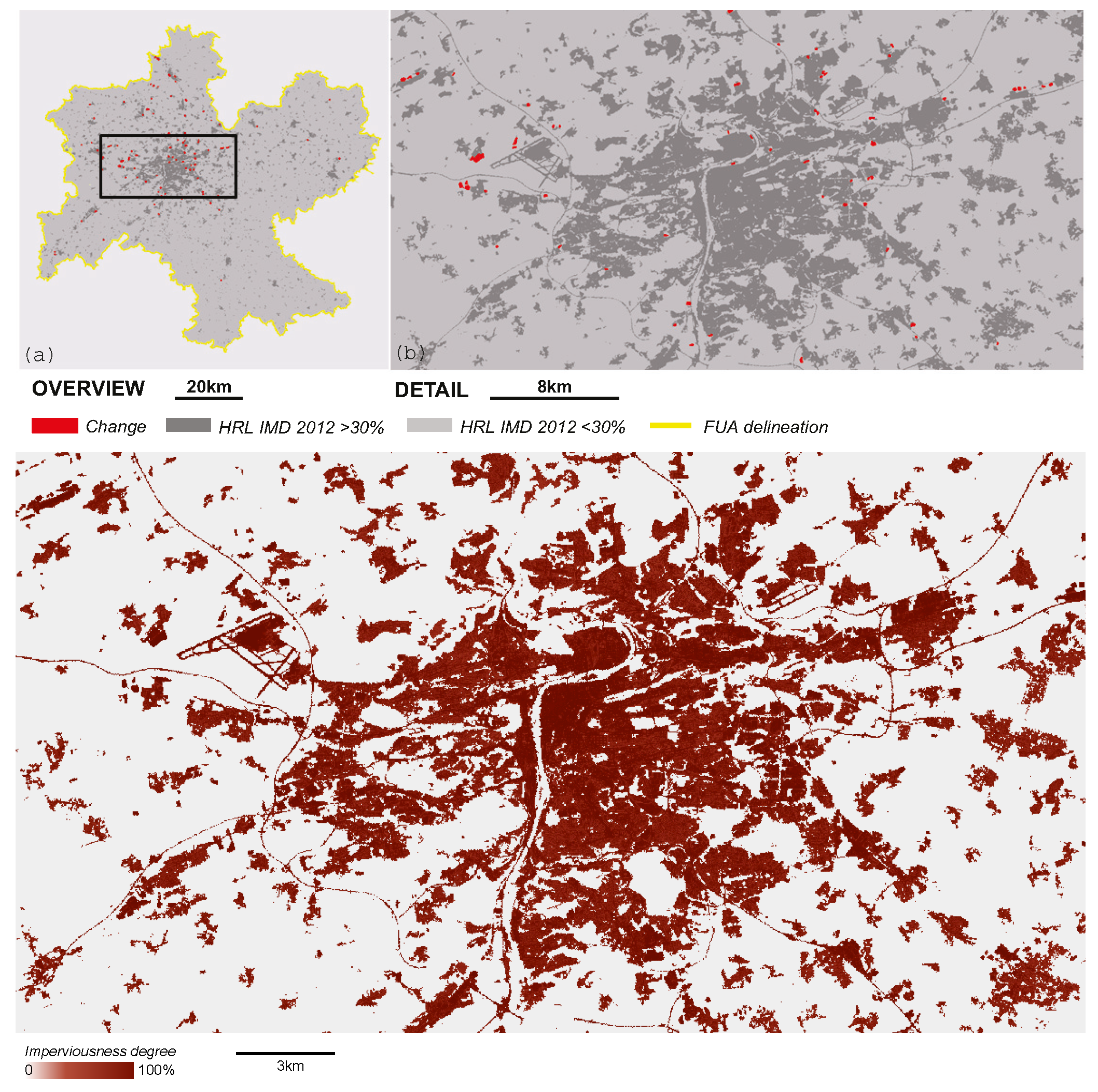 The HRL IMD consists of a m grid covering all of Europe, including Turkey, and aims at representing the degree of imperviousness within each grid cell from 0% to 100%. This layer had already been produced in 2006, 2009 and 2012 and is key for monitoring urban sprawl. The 2015 update will soon be produced and will coincide with an unprecedented coverage of remote sensing data that can be used as input for its production. Previous updates were primarily based on a semi-automated approach (mainly due to the limited availability of input data), and the increased availability of remotely-sensed data can increase the level of automation to produce and update such a large dataset. In addition, because of cloud coverage in a large part of Europe, this amount of images can ensure cloud-free and uniform results at a spatial resolution less than or equal to 20 m to fit the HRL IMD specification. Large datasets are also critical to characterize vegetation phenology false positives to reduce potential confusion between induced agricultural bare soil and artificial surfaces. All of these contributions expected with the use of many data require the design of innovative and efficient methods to process such an amount of data in order to maintain Copernicus Land products’ data production costs down.