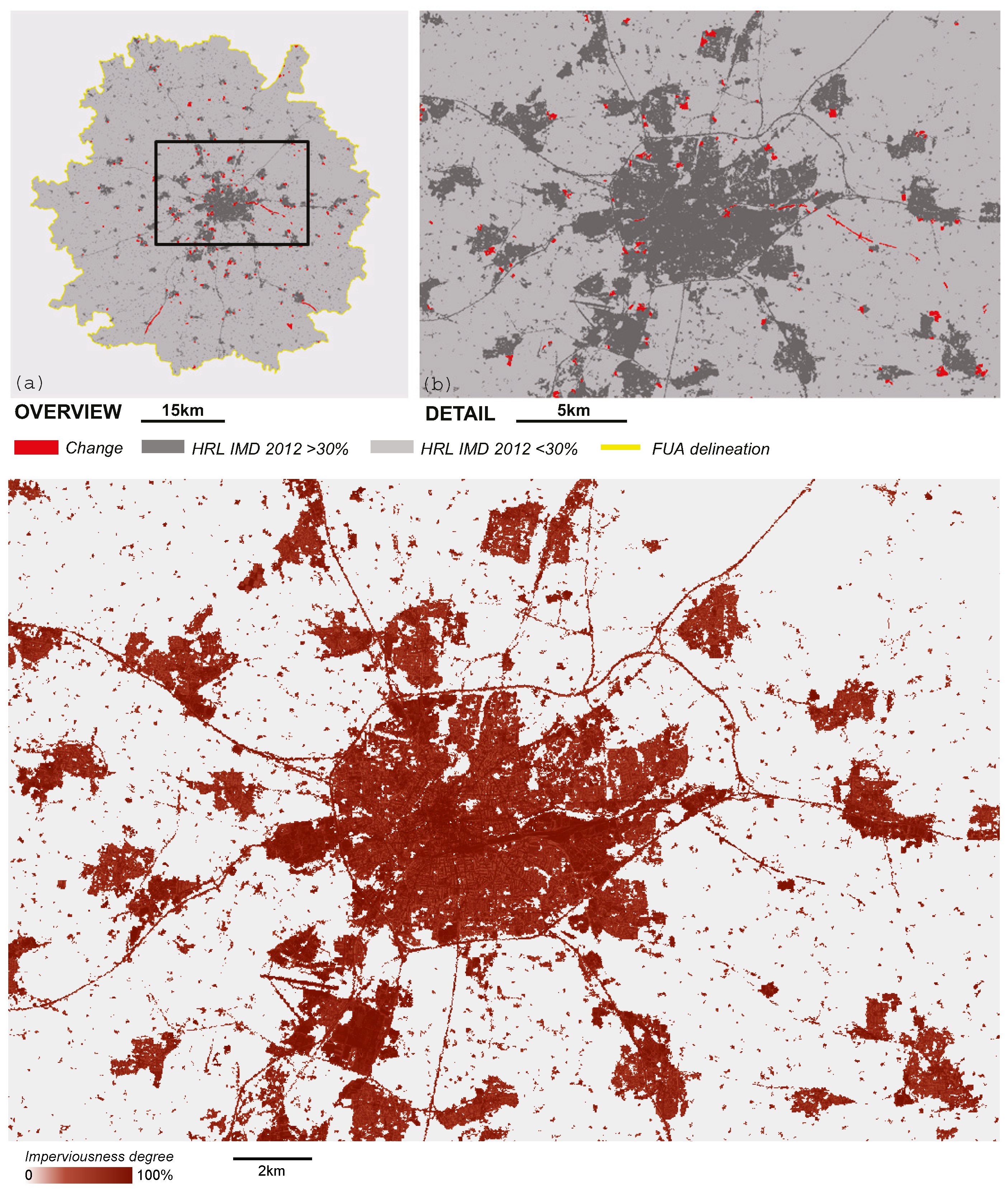 Among those, the HRL IMD, as well as the Urban Atlas (http://land.copernicus.eu/) are key products based on remote sensing data. The strength of these Copernicus Land products relies on the use of high resolution (spatial/temporal) remote sensing data, which provide homogeneity, repetitiveness and objectivity over the whole of Europe, whereas compiling available local and/or national datasets throughout Europe in order to compare cities would be difficult to achieve since the data would originate from different materials and methods.