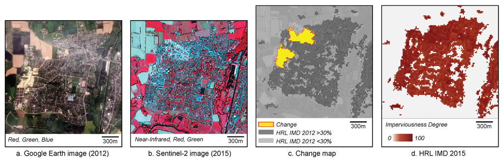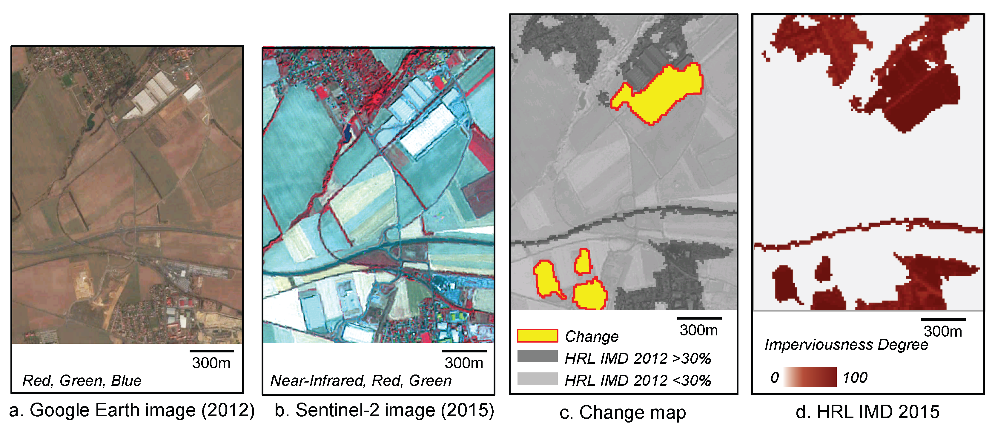Detection of new subdivision in Rennes (yellow: changes; dark grey: HRL IMD 2010 >30%; light grey: HRL IMD 2012 <30%). (a) Google Earth image (2012); (b) Sentinel-2 image (2015); (c) Change map; (d) HRL IMD 2015.