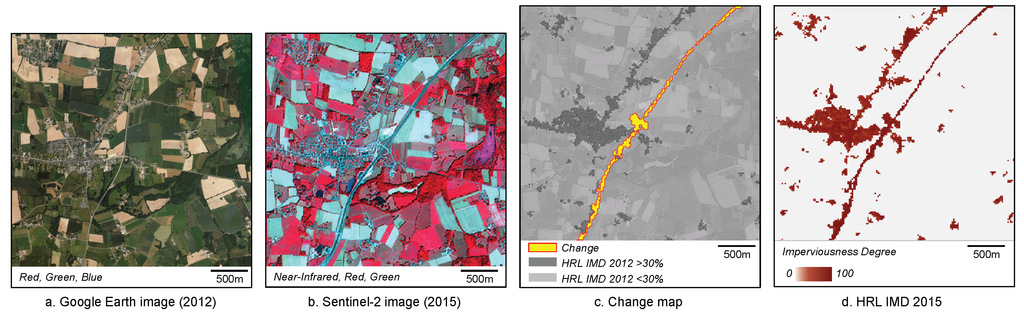 To visually analyze these changes, we have depicted in Figure 13a, Figure 14a and Figure 15a Google Earth image close to 2012 (the date of the generation of the Copernicus HRL IMD; Figure 13a, Figure 14a and Figure 15a), the latest Sentinel image in 2015 (Figure 13c, Figure 14c and Figure 15c) and the detected changes (Figure 13b, Figure 14b and Figure 15b). From these figures, it is interesting to observe that either new commercial or industrial areas (Figure 13b) or thin transport infrastructures (Figure 14b) and residential subdivisions (Figure 15b) are accurately detected, illustrating the efficiency of our process to detect various kinds of urban areas.