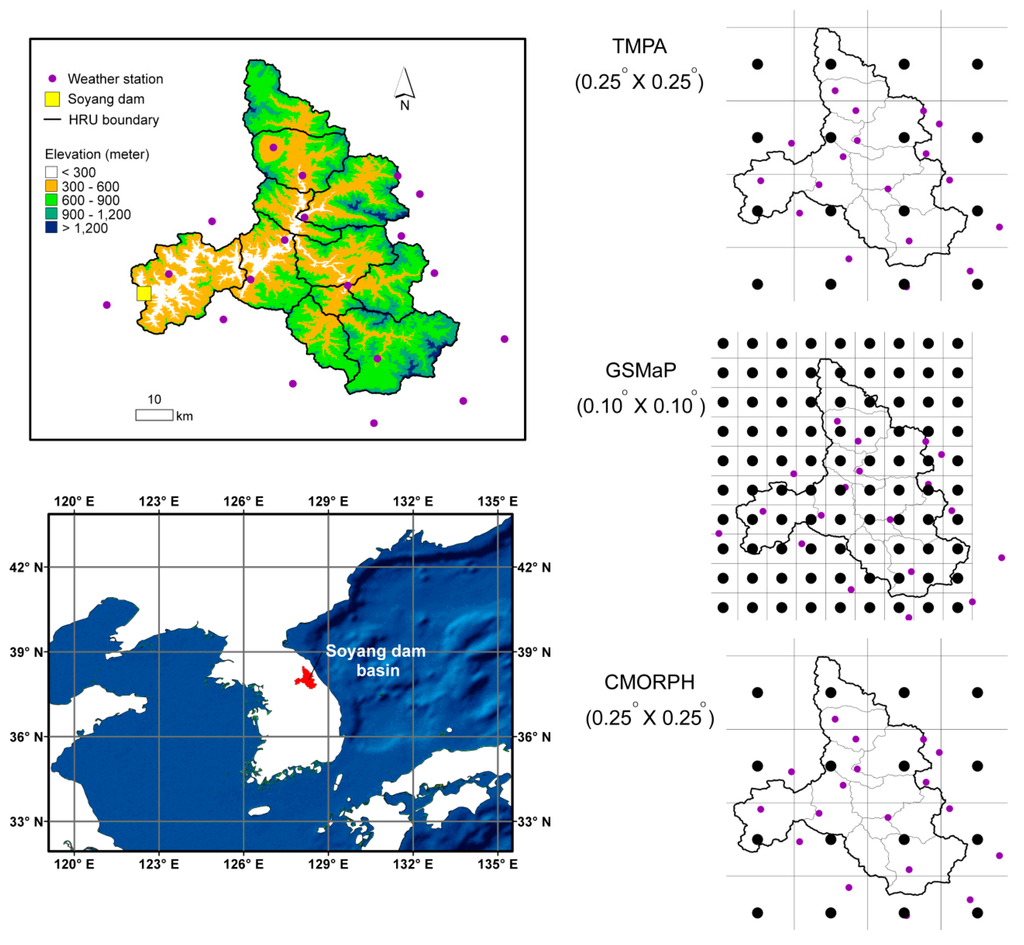 - Kim, J.P.; Park, K.W.; Jung, I.W.; Han, K.S.; Kim, G. Application of high resolution multi-satellite precipitation products and a distributed hydrological modeling for daily runoff simulation. Korean J. Remote Sens. 2013, 29, 263–274. (In Korean) [Google Scholar] [CrossRef]
