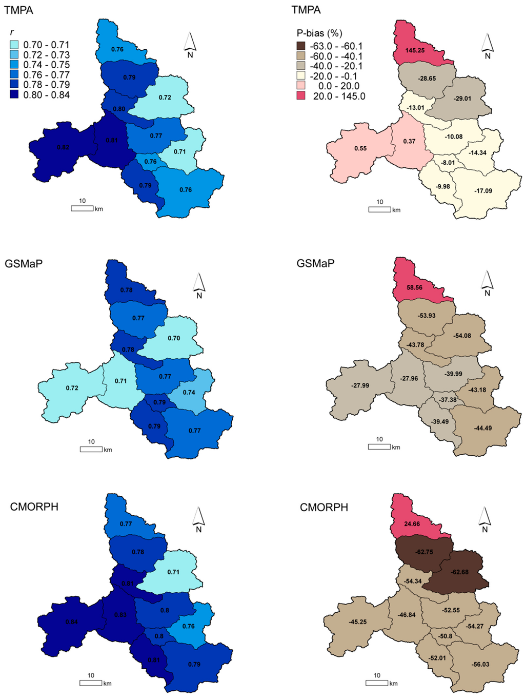 | TMPAv7 | 0.90 | 0.75 | 0.94 | −12.78 | 0.74 | 0.73 | 0.85 | −3.68 |