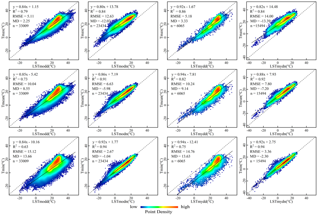 The point density plots of the land surface temperature (LST) products (LSTmodd, LSTmodn, LSTmydd, and LSTmydn) and the observed air temperature (Ta) datasets (Tmax, Tmean, and Tmin). The point density from low to high is expressed by the color ramp from blue to red. RMSE is the Root-Mean-Square Error, and MD is the Mean of the Differences between LST and Ta; the same abbreviations are used throughout the work.