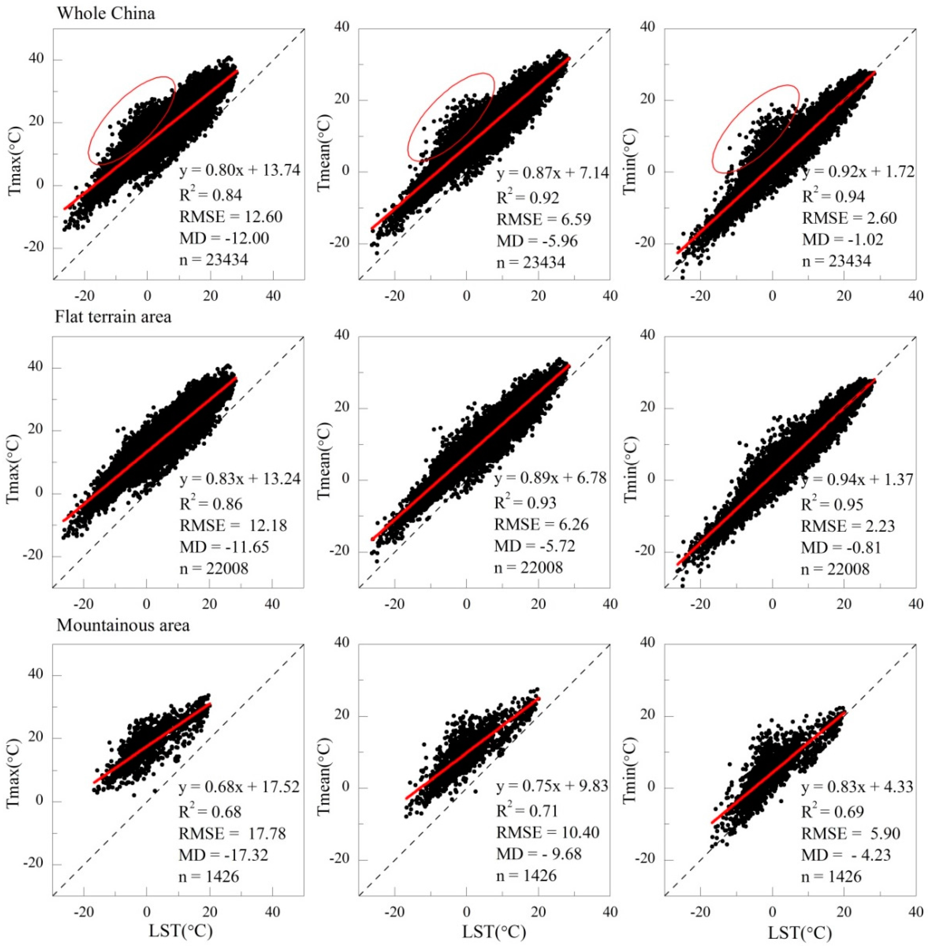 As expected, good agreement between LSTmodn and the observed Ta (2000–2005) is observed in China (R2 > 0.8, slope–1) (Figure 4). The RMSE ranges from 2.6 °C to 12.6 °C, and the MD varies from −12.0 °C to −1.1 °C. The LSTmodn tends to match Tmin best (R2, slope and MD–1) but shows large biases toward Tmax and Tmean. This is most likely due to the LSTmodn overpass time (10:30 pm), which is closer to the time when Tmin was recorded than when Tmax and Tmean were recorded, thus reducing the difference. However, some of the comparison scatter points are more scattered above the regression line. As indicated by the red circle in Figure 4, the linear LSTmodn-Ta relationship is significantly attenuated by this outlier dataset, revealing a triangular trend. The surface thermal dynamics are strongly influenced by the local surface features. Consequently, we identify this outlier dataset as collected from the Himalayas and the Hengduan mountain area located in southwest China where the elevation exceeds 1000 m (digital elevation model (DEM) > 1000 m) and the topographic relief is more than 600 m (RDLS > 1.2) (Figure 1). The complicated LSTmodn-Ta relationship in the Himalayas and the Hengduan mountain area is modified by the complex terrain and its related factors, such as elevation and solar radiation interception.
