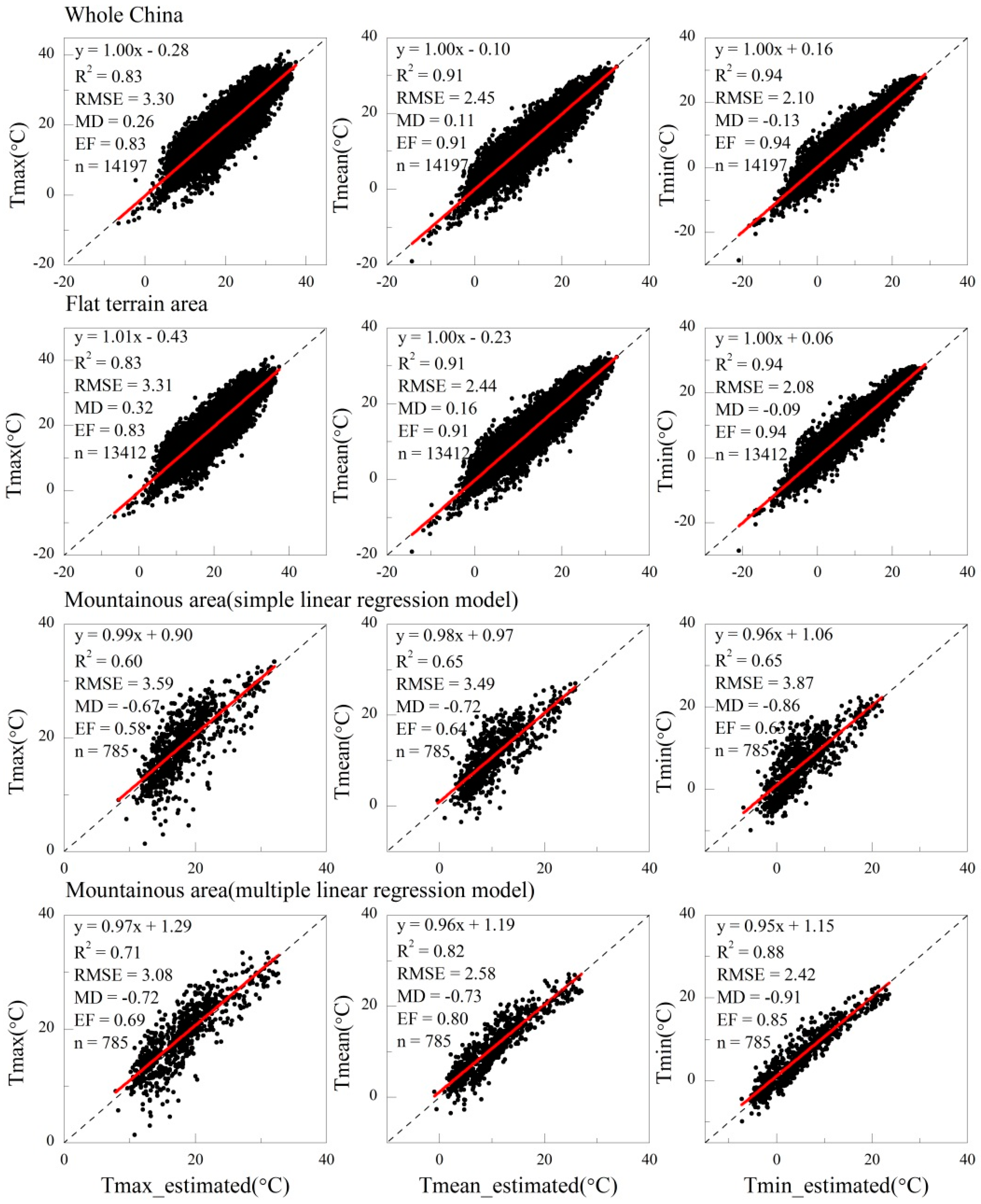 The linear relationship between the monthly observed and the estimated Ta in different regions. The Ta predicted over the entirety of China is combined by the flat terrain area and mountainous area (multiple linear regression model). EF is the model efficiency.
