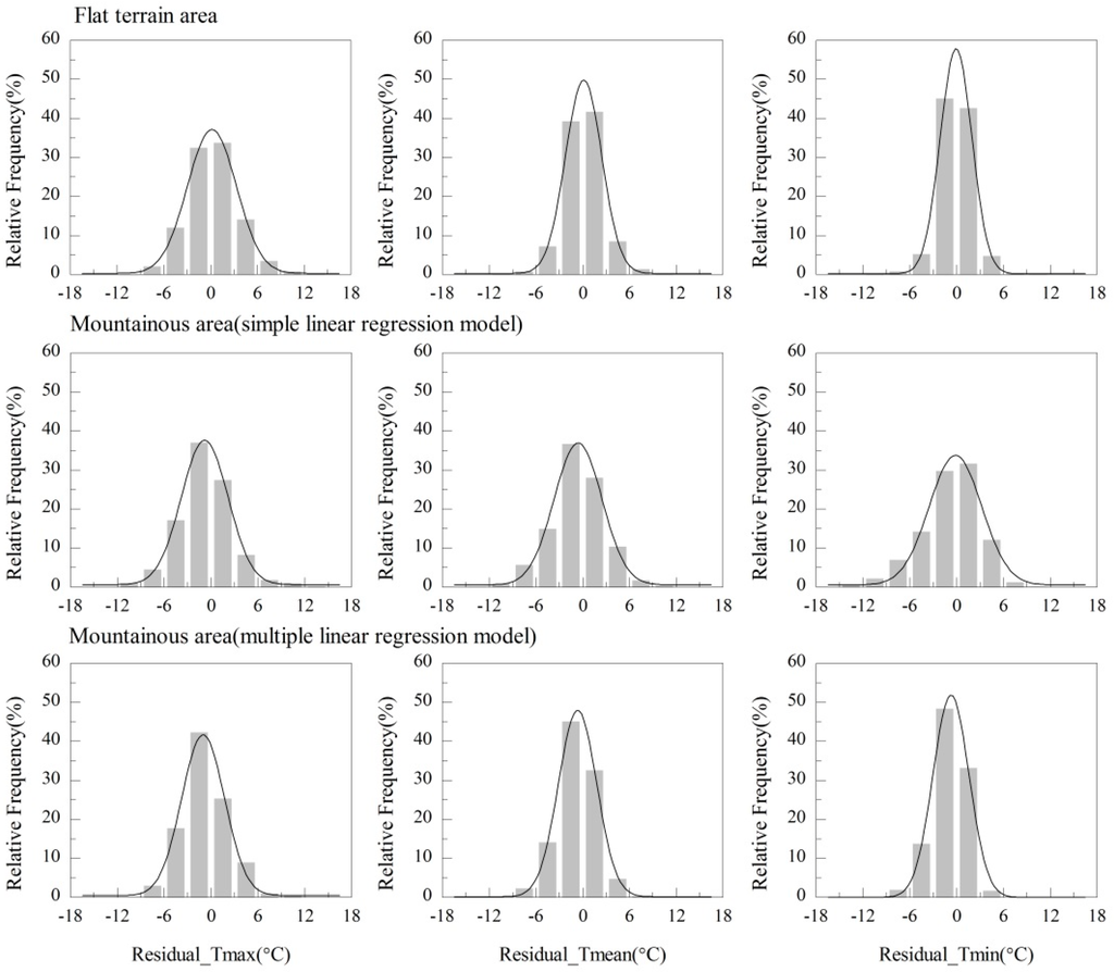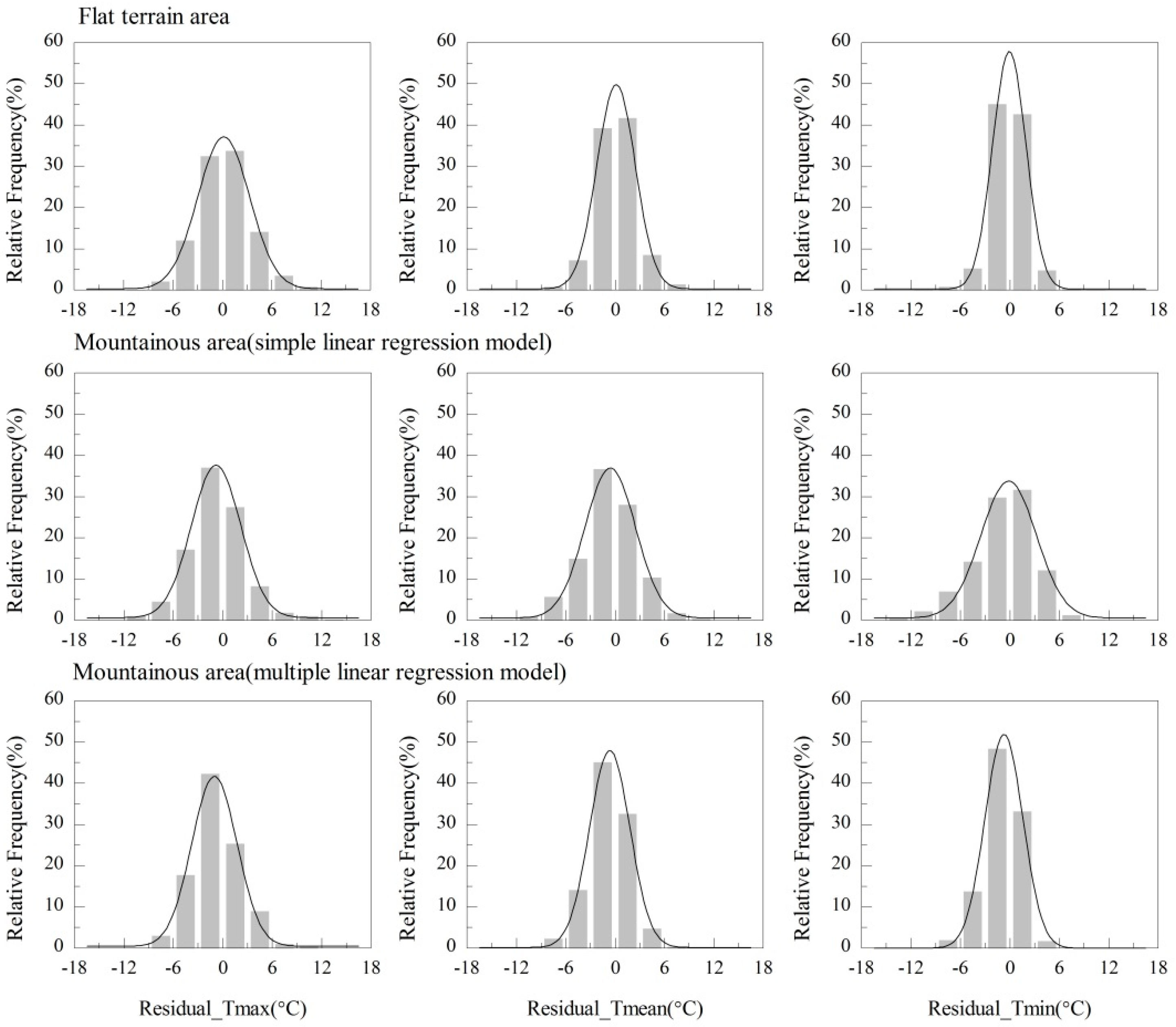 In the flat terrain area, the monthly Ta is estimated as a function of LSTmodn and is highly consistent with the observed Ta. The frequency distribution of the estimation residual is symmetrical around zero (Figure 6). The relative frequency of the residual is largely concentrated within the range −3 °C and 3 °C (66%–88%). The average observed Tmax, Tmean, and Tmin are 21.2 °C (ranging from −8.1 °C to 41.0 °C), 15.4 °C (ranging from −19.1 °C to 33.3 °C), and 10.8 °C (ranging from −28.6 °C to 28.1 °C), respectively. The average simulated Tmax, Tmean, and Tmin are 21.5 °C (ranging from −6.5 °C to 37.4 °C), 15.6 °C (ranging from −14.3 °C to 32.5 °C), and 10.7 °C (ranging from −21.0 °C to 28.7 °C), respectively, showing a perfect match with the observed Ta. However, in the southwest mountainous area, the multiple linear regression model is developed to derive Ta, and the outcomes are encouraging. As shown in Figure 5, the monthly Ta predicted by the multiple linear regression model appears to be more linearly correlated with the observed Ta than the simple linear regression model. By applying the multiple linear regression model, the correlation coefficient of R2 increased substantially from 0.60–0.65 to 0.71–0.88. Meanwhile, the RMSE decreased from 3.49–3.87 to 2.42–3.08, and the distribution of the estimation residual is more concentrated around 0 °C (Figure 6). Furthermore, the EF values of the multiple linear regression models are closer to 1, indicating a better description of the observed mean than that of the simple linear regression model.