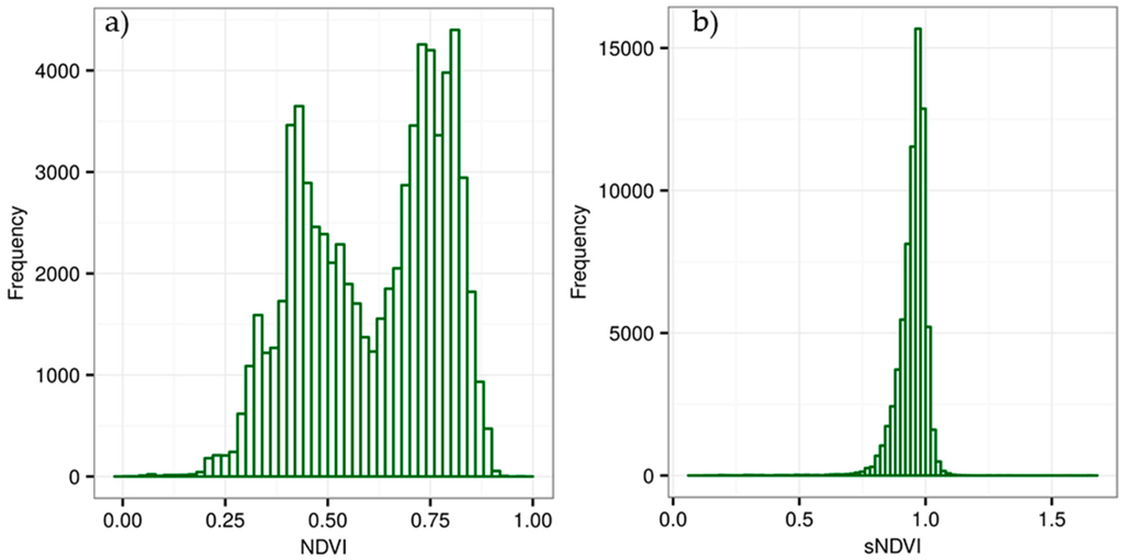 An example of distributions of observations in the reference cube before (a) and after (b) reducing the seasonality in a space-time data cube using spatial context. sNDVI denotes spatially normalised NDVI—after applying the spatial context method. Note that some values for spatially normalised NDVI are above 1 because we used 95 percentile to normalise the pixel values. Such values represent NDVI values which were above 95 percentile.