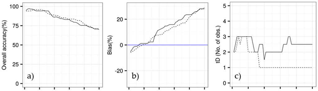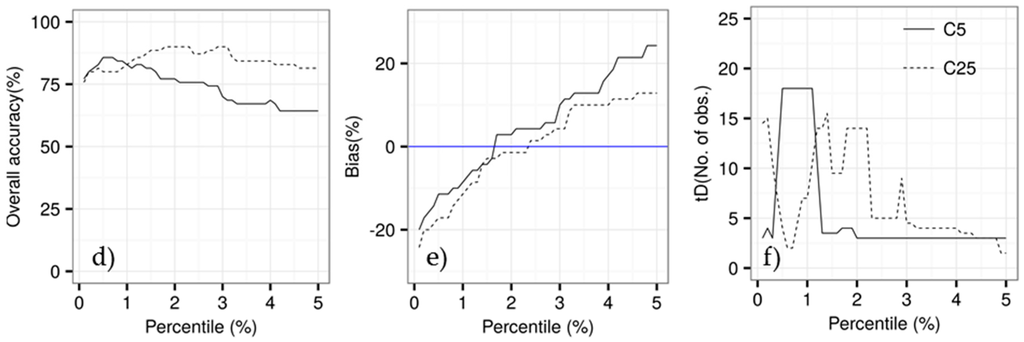 Figure 6 shows an example of how overall accuracy, bias, and median temporal detection delay were changing in relation to the percentile threshold. Here, we only show examples for the smallest (C5) and largest (C25) cubes for each study site. Generally, larger percentiles produced lower overall accuracy (Figure 6a,d) and shorter median temporal detection delay (Figure 6c,f), except for the C25 at Brazilian site. Deforestation events were increasingly being omitted (negative bias) when using smaller percentiles (Figure 6b,e).