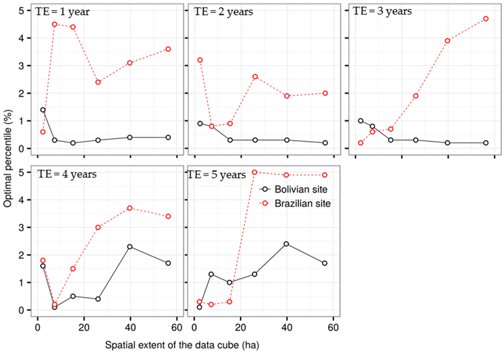 Figure 7 shows how the optimal percentile changes for different combinations of spatial and temporal extents. For longer temporal extents (TE = 4 or 5 years), the optimal percentile is higher for larger spatial extents (Figure 7). Generally, the optimal percentiles at the Brazilian site were larger than those for the Bolivian site. At the Bolivian site, the optimal percentile was smaller than 3% for each spatial and temporal extent combination.