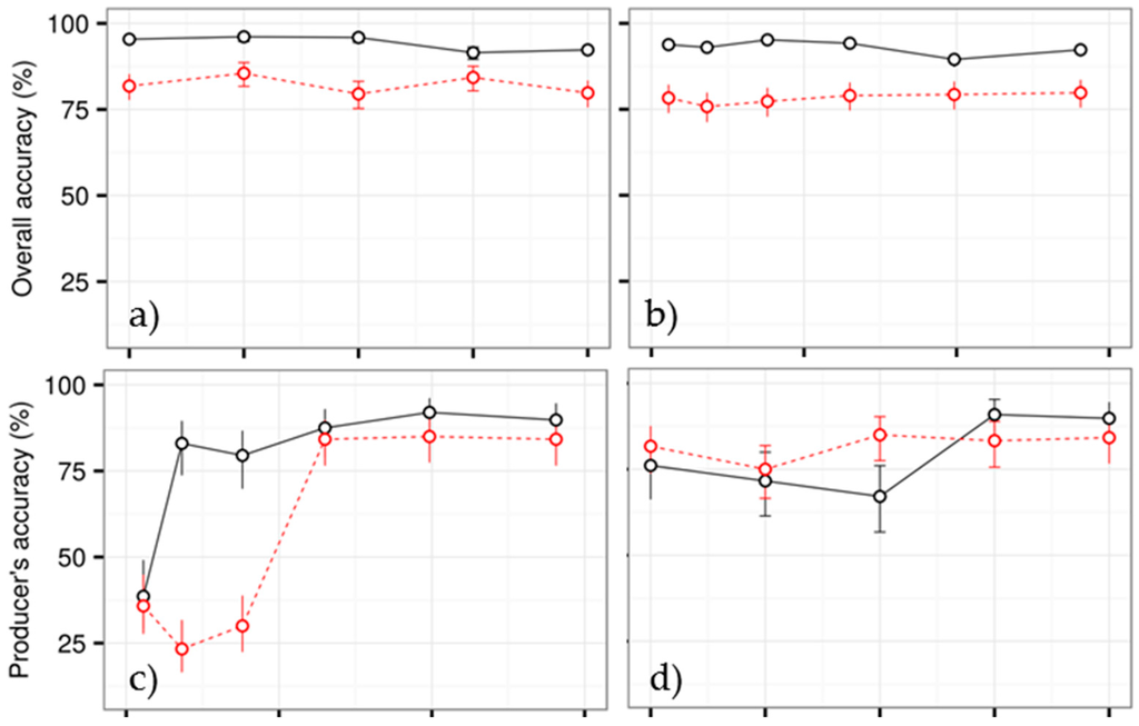 Our method offers new opportunities to tackle challenges associated with existing methods for monitoring deforestation at sub-annual scales [3,4,5,6,29]. In particular, our method exploits both spatial and temporal information in satellite image time series to detect deforestation at a sub-annual scale, thus allowing us to analyse pixels which do not have many historical observations. Results from the two case studies indicate that our method is robust in detecting deforestation events at a sub-annual scale, even when the image time series only contains one year of historical observations (Figure 8). One year of historical observations is often too short to properly differentiate deforestation from normal forest dynamics, especially in forests that exhibit strong seasonality. By combining spatial and temporal information, we can use image time series of high spatial resolution satellite sensors (e.g., RapidEye), whose time series are short, to track small-scale forest disturbances (e.g., selective logging). Similarly, by exploiting spatiotemporal information in image time series, there is no need to wait for image time series from newly launched sensors (e.g., Sentinel-2) to lengthen before exploiting such data to detect deforestation events at sub-annual scales. Since our method remains robust in detecting deforestation at sub-annual scales even when the reference period only contains one year of data, users may not need to pre-process huge amounts of historical data when monitoring deforestation at sub-annual scales.