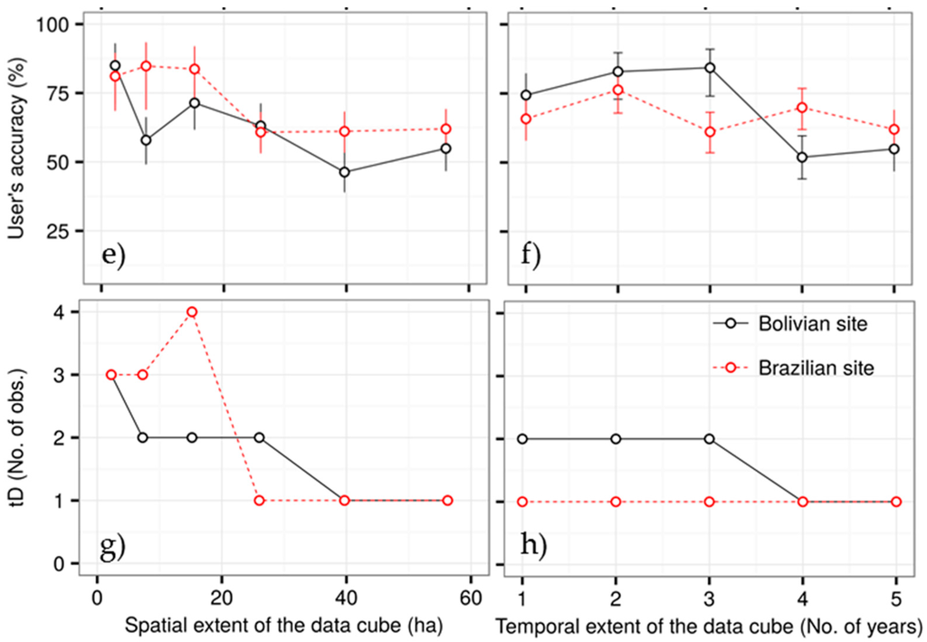 Overall accuracy (a,b); producer’s accuracy (c,d); user’s accuracy (e,f); and median temporal detection delay (tD) (g,h) of deforestation events at the Bolivian and Brazilian study sites as a function of the spatial (left) and temporal extent (right) of the local data cube. Vertical bars (a–f) indicate 95% confidence intervals. The effect of the spatial extent on spatial and temporal accuracy (Figure 8a,c,e,g), is shown for the results obtained from the longest temporal extent (TE = 5 years). The effect of the temporal extent is shown for the results obtained from the largest spatial extent (56.25 ha, Figure 8b,d,f,h).