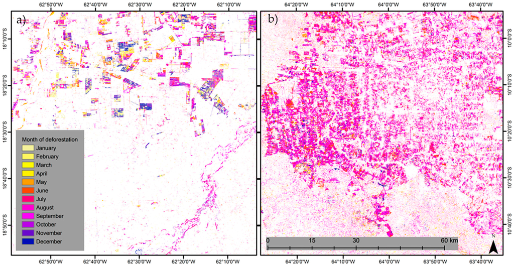 The month in which deforestation events detected from Landsat time series at Bolivian site (a) and Brazilian site (b) over the period of 2005–2014 occurred. Deforestation was detected as an extreme event in Landsat data cube with a reference period containing one year of data.