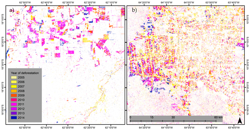 The year in which deforestation events detected from Landsat time series at Bolivian site (a) and Brazilian site (b) over the period of 2005–2014 occurred. Deforestation was detected as an extreme event in Landsat data cube with a reference period containing one-year of data.