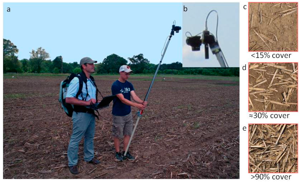 Photographs of: (a) the image and spectra acquisition from the research field in Beltsville, MD, USA; (b) detail of the digital camera and the 18° fore optic of the spectroradiometer aligned; and examples of the soil surface covered by (c) <15%; (d) 30% and (e) >90% of crop residues.