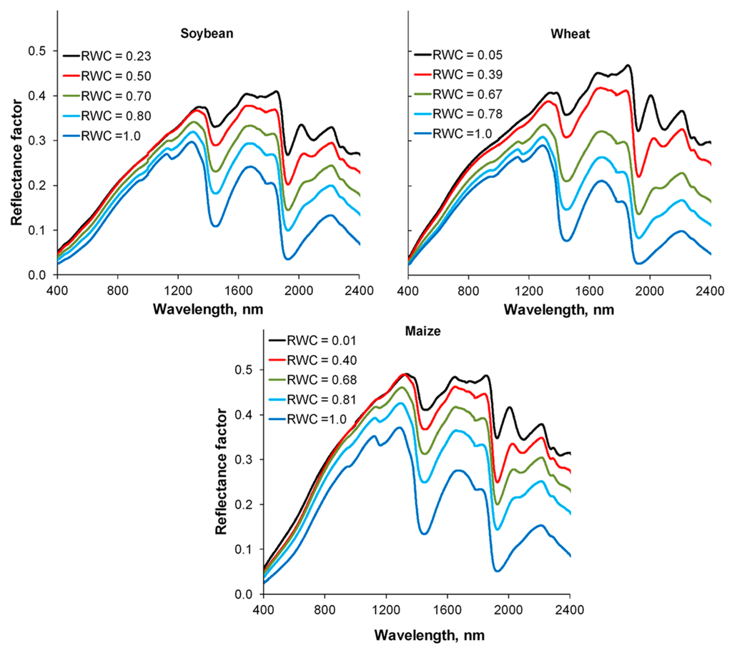 In our field experiment, the soil, maize residues and water contents were quite uniform. Within any real agricultural scene, variations in topography, soil roughness, soil texture, green vegetation cover and precipitation affect moisture conditions and spectral reflectance. Therefore, these correlations to estimate RWC in a scene should be used with caution. Additional information about the local soil reflectance and crop type may be useful for estimating scene moisture conditions.