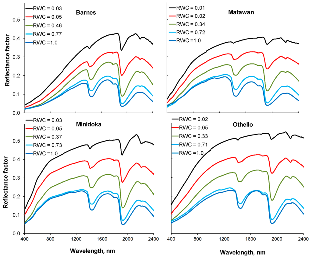 Representative reflectance spectra of maize residues on the Matawan soil collected in the field at various RWC levels are presented in Figure 8. Atmospheric water absorption features near 1450 and 1960 nm attenuated the incoming solar radiation and were removed.