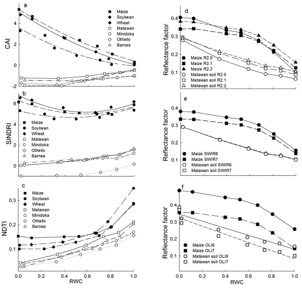 Water also significantly affected CAI, SINDRI and NDTI for the three crop residues and four soils (Figure 4). As RWC increased, CAI decreased for crop residues, but increased for soils (Figure 4a,d). CAI estimated the depth of the cellulose absorption feature near 2100 nm. Water in the crop residues significantly attenuated the cellulose absorption feature, which resulted in CAI declining as RWC increased. However CAI of the soils increased slightly as RWC increased (Figure 4a,d). As a result, CAI values of the soils and crop residues nearly converged as water contents approached saturation.