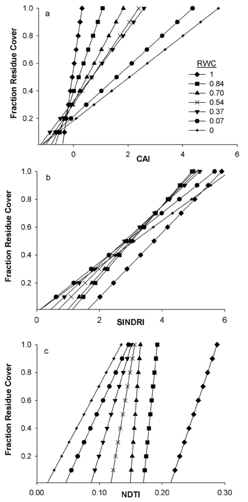 In summary, the responses of spectral crop residue indices to RWC were similar in both laboratory and field experiments. Clearly, estimates of scene RWC are required to reliably assess fR regardless of which crop residue spectral index is used. We hypothesize that models developed to predict fR using the laboratory data (Table 4; Figure 4) should predict fR for the field experiment.