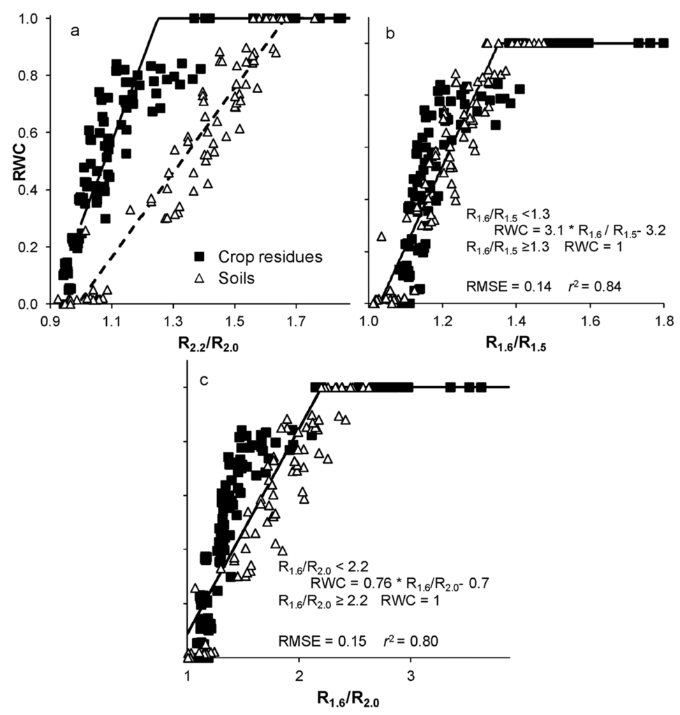 Clearly, reliable remotely-sensed estimates of crop residue cover must account for spatial and temporal variations in the RWC of crop residues and soils. However, direct measurements of RWC are impractical for large areas in a timely manner. Thus, spectral water indices that can estimate the spatial and temporal variability of RWC are required. Reflectance in the shortwave infrared region (SWIR) is particularly sensitive to the water content of soils and vegetation [35,44,45]. We examined the ability of several existing and new SWIR spectral water indices to estimate RWC of crop residues and soils. Ideally, the spectral bands used for the water indices would be included in the complement of spectral bands for each satellite sensor. In most cases, RWC was linearly related to the ratio water indices until the soils and crop residues were nearly saturated, i.e., RWC > 0.9 (Figure 6). The linear-, quadratic- and exponential-plateau models significantly fit the data, and the RMSE for the linear-plateau model is shown for comparison purposes (Table 4). Although the reflectance ratio R2.2/R2.0 was highly related to the RWC, the relationship differed for soils and crop residues (Figure 6a). Daughtry and Hunt [20] observed that R2.2/R2.0 described the changes in the slope of fR vs. CAI as RWC varied, but did not estimate RWC directly. The reflectance ratios R1.6/R1.5 and R1.6/R2.0 were equally valuable for the soils and crop residues (Figure 6b,c), which is an advantage, as most agricultural scenes are combinations of soils and crop residues. The indices R1.6/R0.8 [33] and the Normalized Difference Infrared Index [36] were also related to RWC, but did not perform as well as R1.6/R1.5 and R1.6/R2.0 (Table 2).