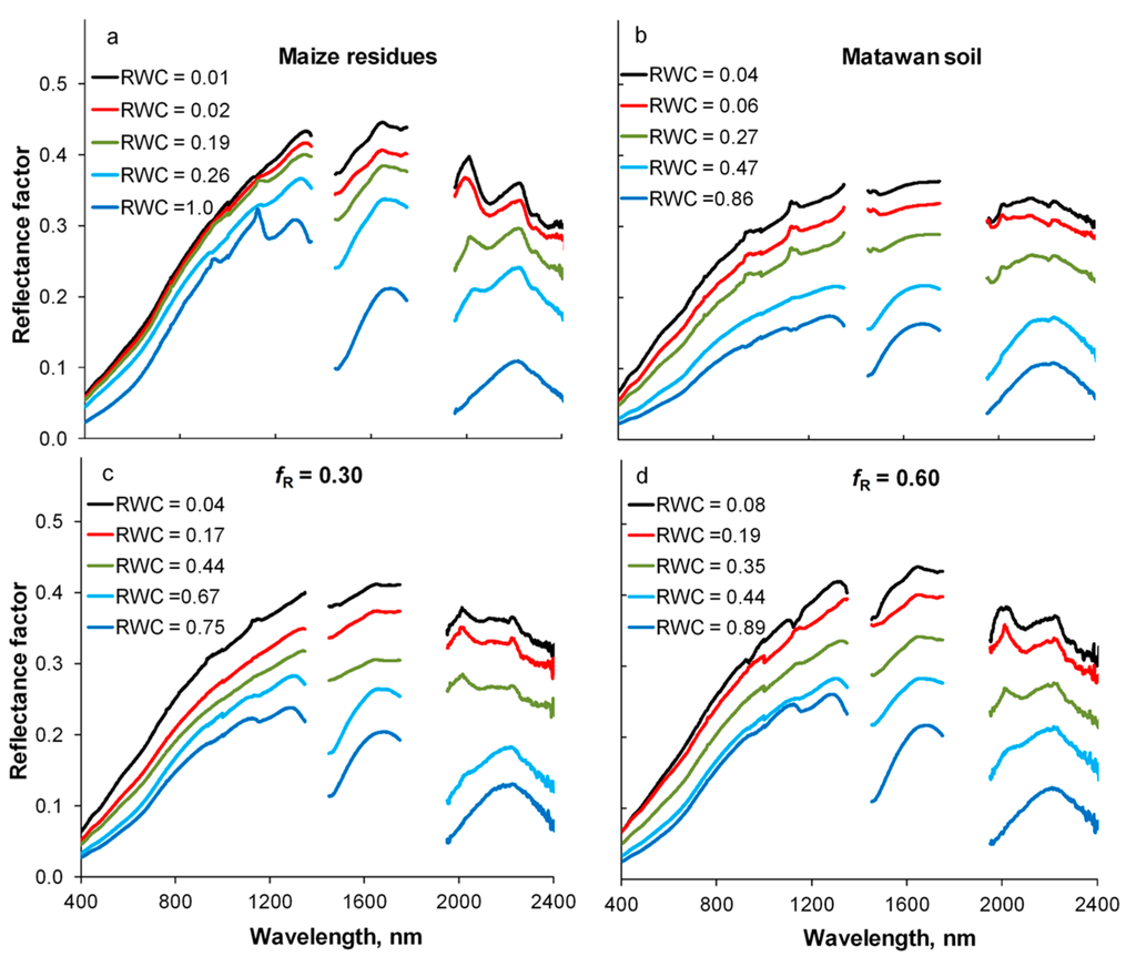 Reflectance factors of the soils and crop residues were plotted as a function of wavelength and RWC. In the laboratory experiment, the reflectance of mixed scenes R(M,λ) with various proportions of crop residues and soils was simulated using linear combinations of the reflectance factors for crop residues and soils [16,20]: