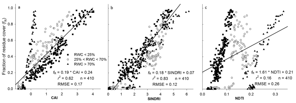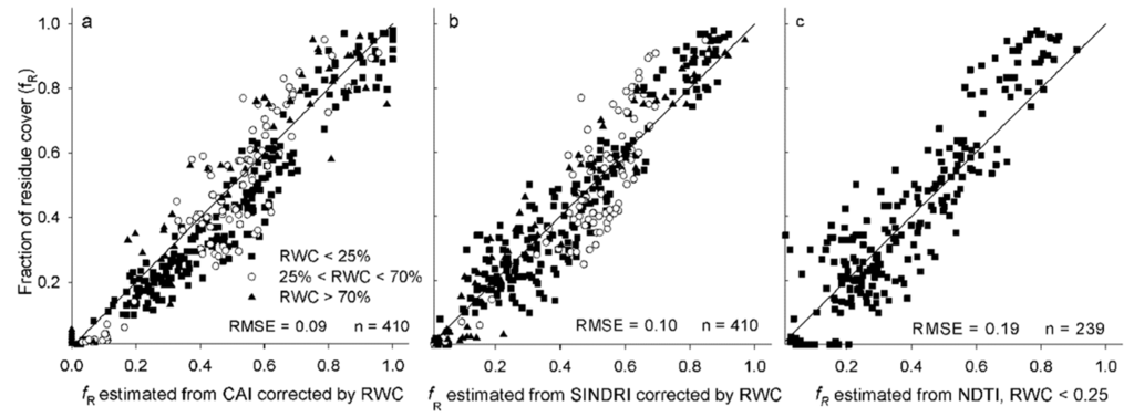In the field experiment, some of the unexplained variability was probably associated with the experimental protocol for determining residue cover and RWC. The accuracy of SamplePoint measurements to determine ground-cover under field conditions ranges from 92%–98% depending on the quality of the image analyzed [41]. Determining the water content of soil and residue samples is associated with some uncertainty, as the moisture distribution is not homogenous and is affected by soil texture and litter composition [50,51]. Considering this unexplained variability inherent to the field dataset, the accuracy attained (RMSE = 0.09–0.12) when using the equations based on CAI and SINDRI to predict fR was very high.