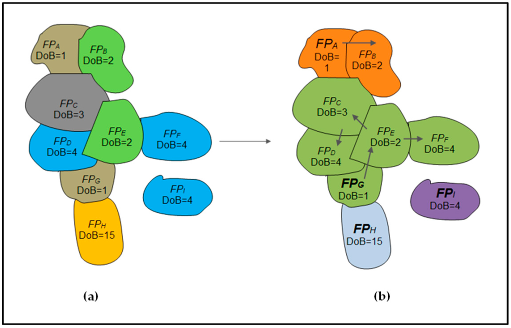 (a) Original Fire Patches (PFs) and (b) possible four active fire clusters derived from the algorithm implementation. The black arrows display a fire path history determined by the causal relation configuration of Figure 2a. Points of ignition for this configuration are FPA (Date of burning: 1); FPG (Date of burning: 1); FPI (Date of burning: 4) and FPH (Date of burning: 15).
