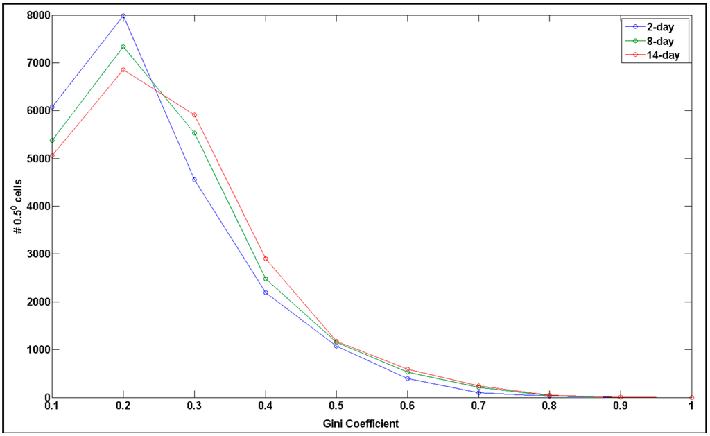 Gini coefficient global frequency distributions for time-gaps 2-, 8- and 14-day.