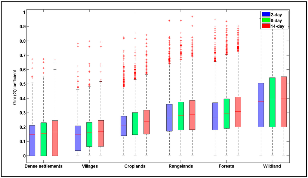 Gini coefficient values for the six major Anthrome classes using 2-, 8- and 14-day time-gaps.