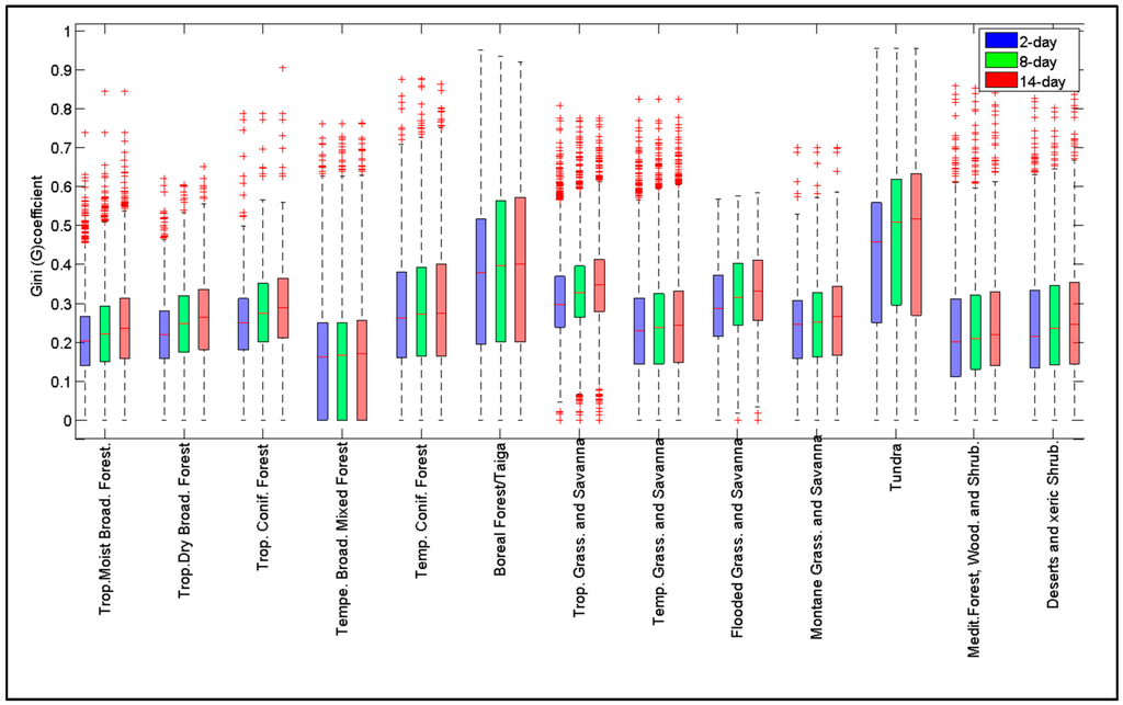 A biome based analysis [18], picks up a pattern not discernible with the Anthromes data: Gini coefficient sensitivity to time-gap is relatively higher in tropical biomes, such as Tropical Dry Broadleaf Forest, Tropical Grasslands and Savannas, and Flooded Grasslands and Savannas (most of which are located in the tropics) than in temperate of boreal biomes, with the lowest sensitivities occurring in Temperate Broadleaf Mixed Forests and in Temperate Conifer Forests.