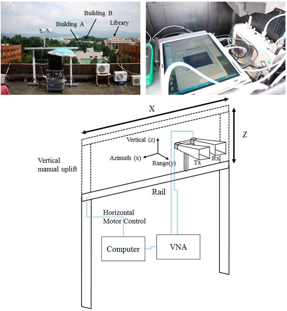 Recently, a few ground-based tomographic SAR (GB-TomoSAR) systems have been used to obtain test dataset for the algorithm development and the concept design. Xing et al. [19] developed a ground-based X-band TomoSAR system and measured some man-made objects, such as corner reflectors and a truck, artificially set for the experiment. Based on a GB-SAR system developed by Lee et al. [20], Ji et al. [21] have reported the construction of a GB-TomoSAR system operated in C-band that have imaged distributed targets such as buildings, road, stairs, and trees. More recently, ground-based tomographic SAR systems have been widely applied to forest, vegetation, snowpack and sea ice [22,23,24,25,26,27].