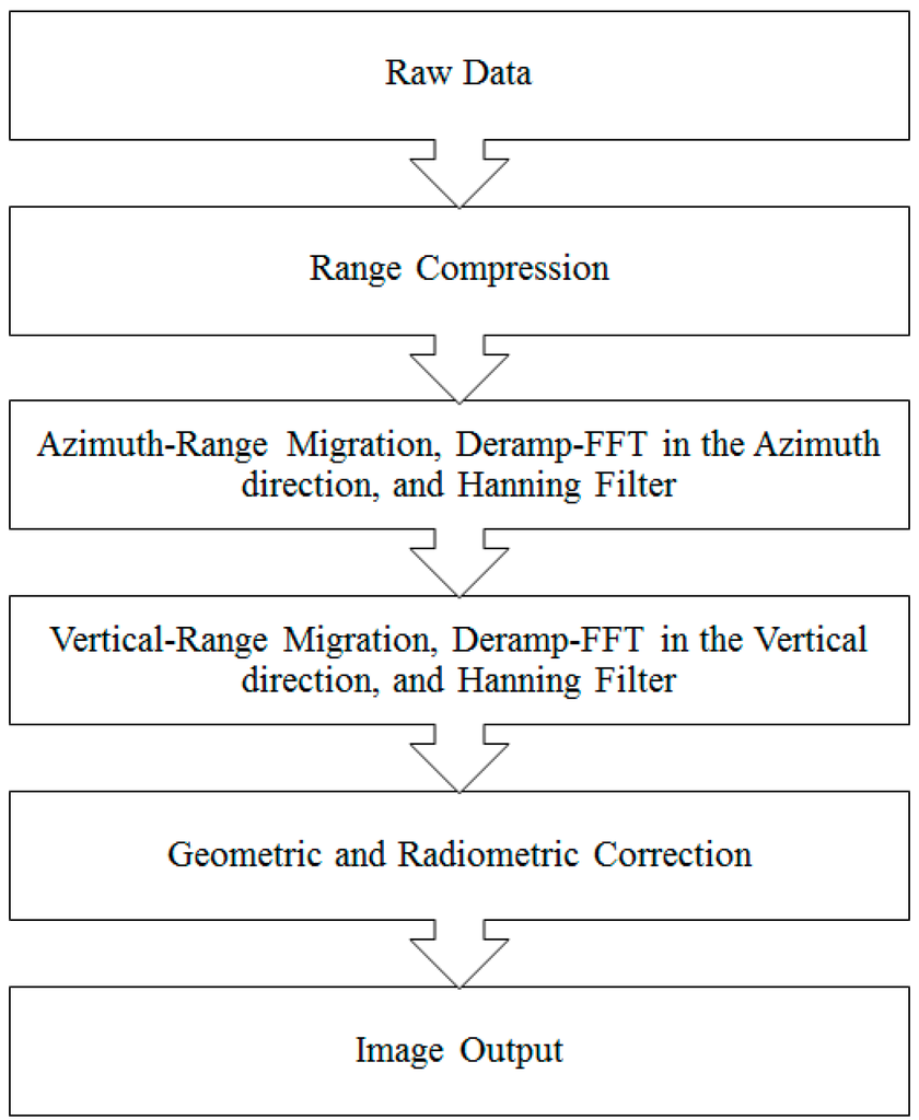 During the data processing, we arrange the received signal by using the range migration, multiply the two-dimensional deramp function h−1(x, z), apply the Hanning filter, and then use the iFFT both in azimuth and vertical directions (Figure 2).