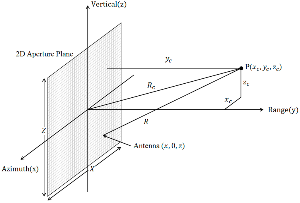 where λ is the wavelength. (x, z) is the position of the antenna, X and Z are the synthetic aperture length and Lx and Lz are the antenna aperture size, all in azimuth and vertical direction, respectively. R is the range from the antenna to the target, i.e.,