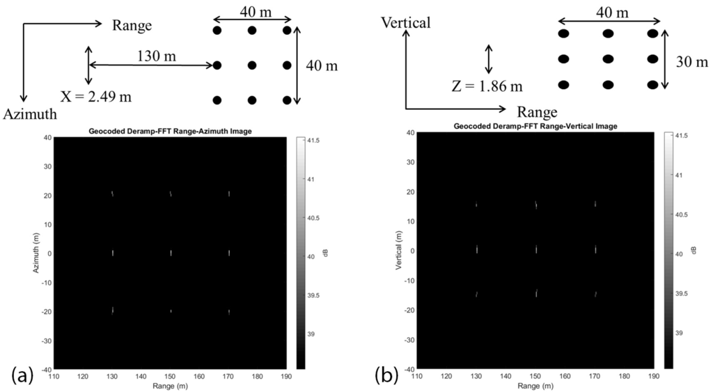 We simulate the GB-TomoSAR system to verify the developed focusing algorithm and to design field experiments. The artificial targets consist of a three-dimensional array of 3 × 3 × 3 point scatters as shown in Figure 4. The system specification of the simulation is shown in Table 1, which is identical to those of the field experiment in the next section. Figure 4 shows the simulation result showing range-azimuth and range-vertical slice images in the image center line. The random noise of 1 mm RMS error was implemented to access the tolerance of the system from positioning error. The images clearly show the focused point targets at the original location with the resolutions close to the theoretical values of 1.5 and 2.0 m at 130 m range in azimuth and vertical direction, respectively. The ISLR (Integrated Side Lobe Ratio) was measured to be −11.22 dB and −11.38 dB in azimuth and vertical direction, respectively. The amplitude of the peak was measured to be 0 dB while the phase coincides almost exactly with the modulus of 2π of range. The critical range ycrit is calculated to be 10.3 m when the critical phase error is set to be δφ = π/10. Therefore, we confirmed that the two-dimensional deramp-FFT algorithm is acceptable in the range over 10.3 m, and is useful for the three-dimensional GB-TomoSAR imaging.